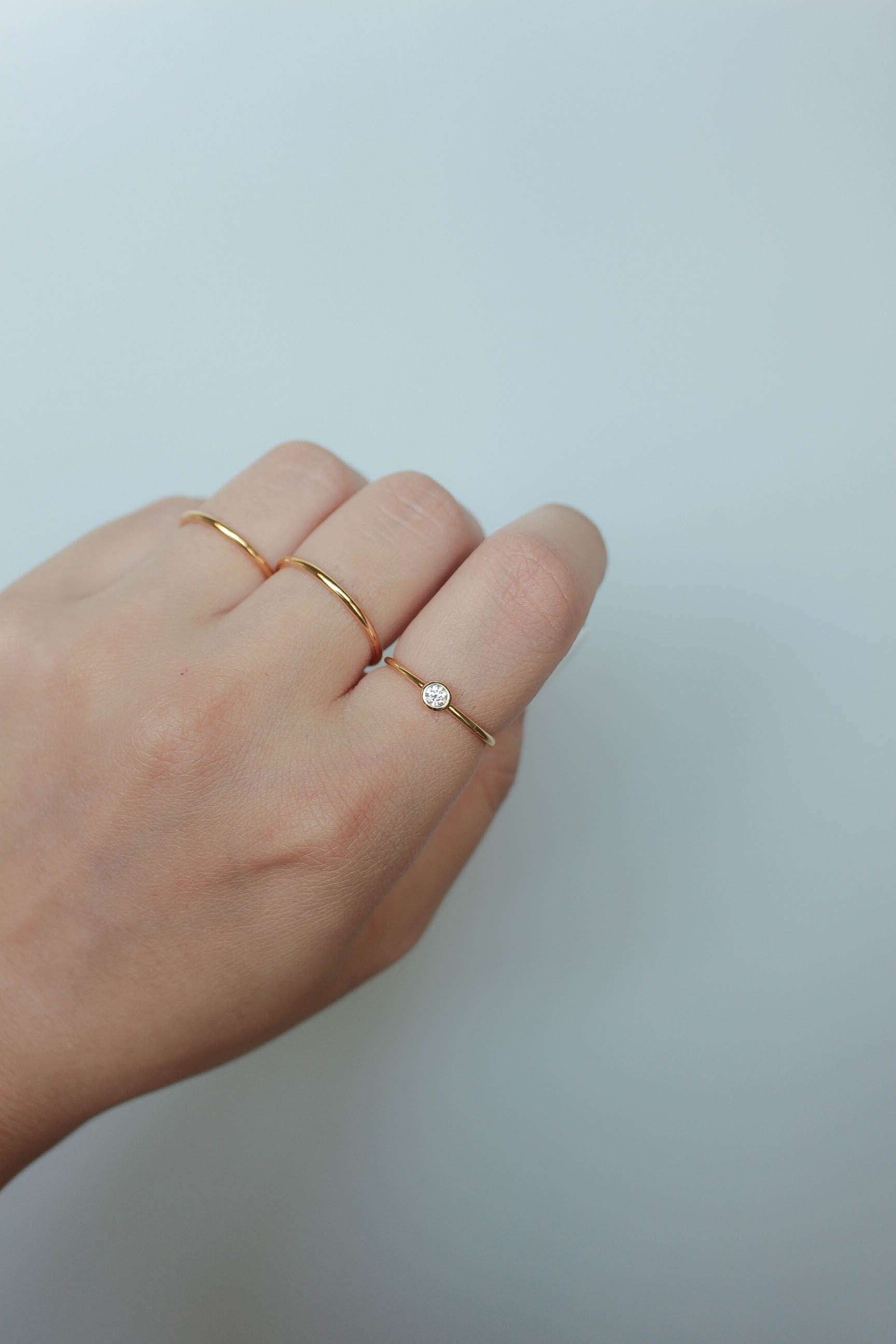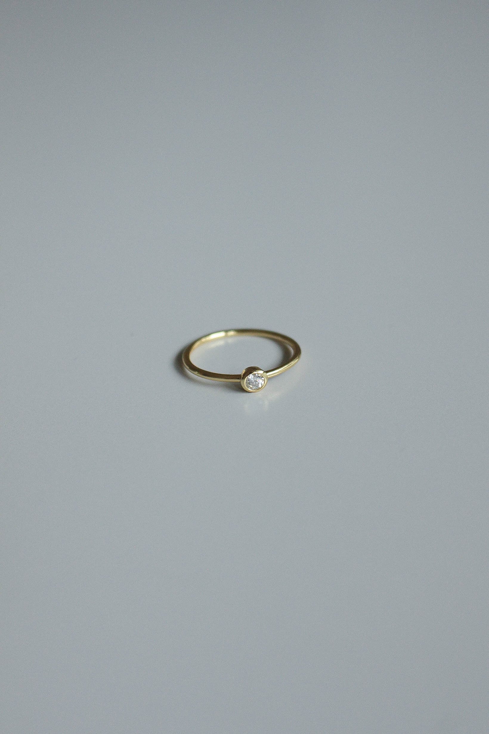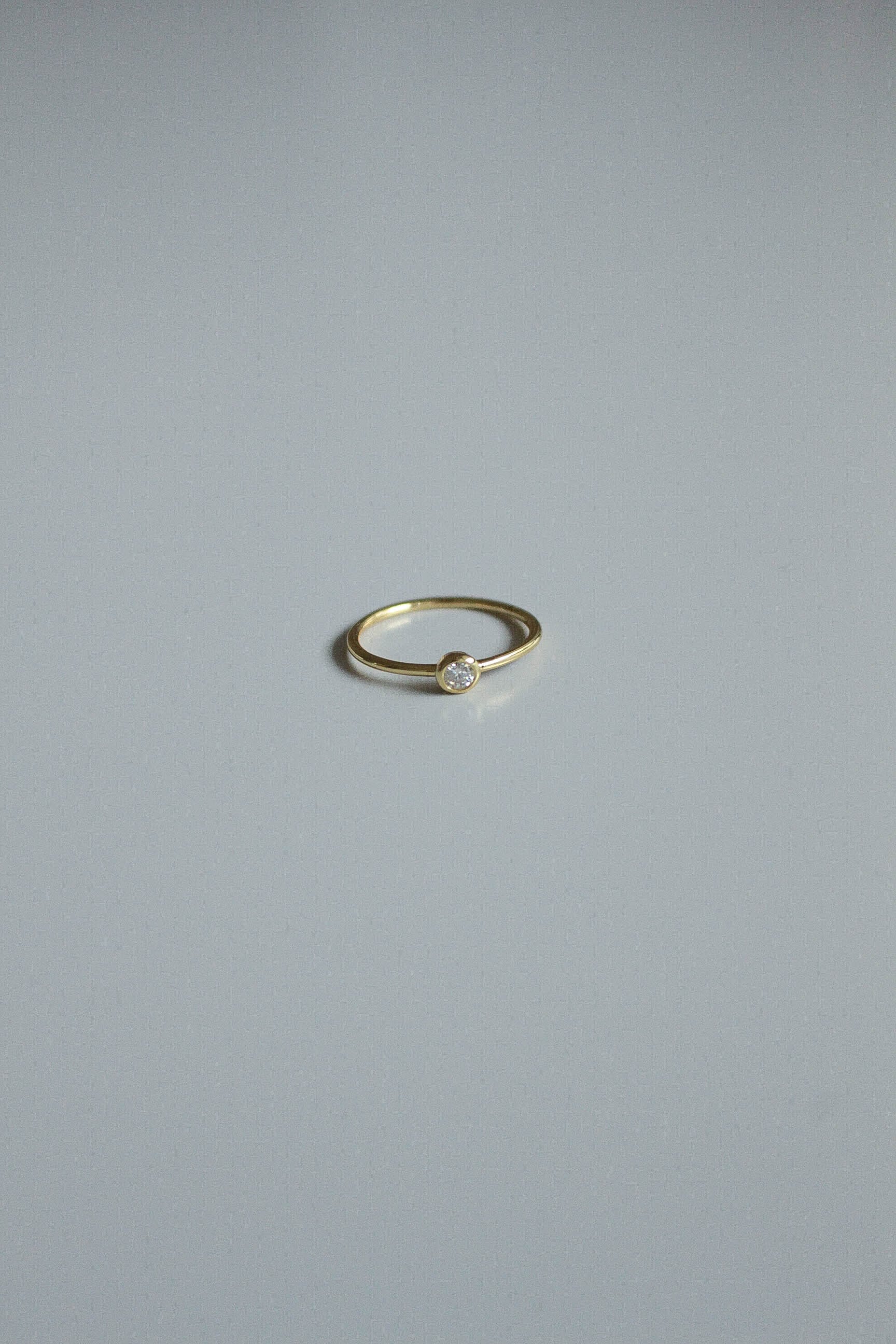 細身のシンプルなフレームに1粒ジルコニアダイヤを埋め込んだミニマルなリング。