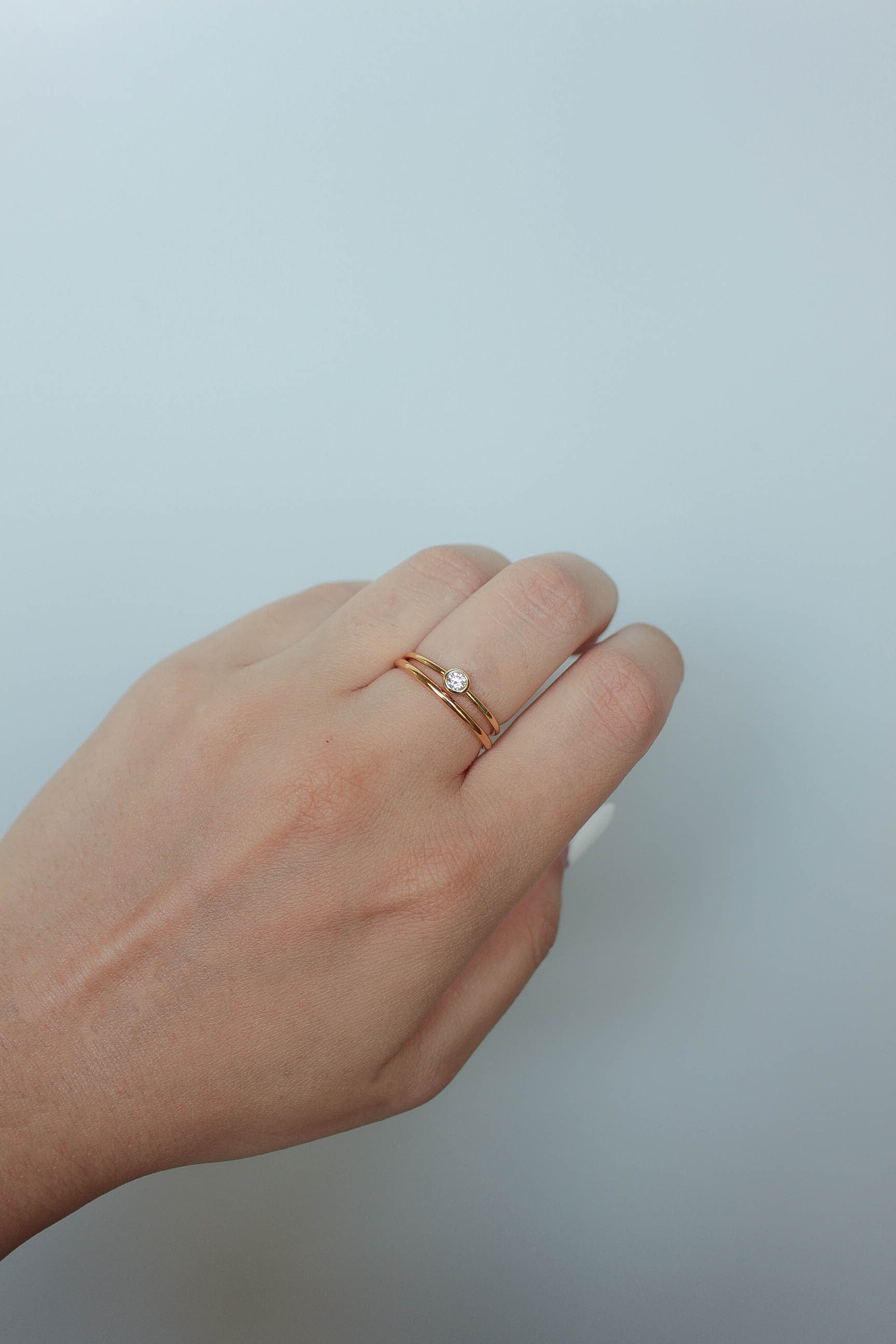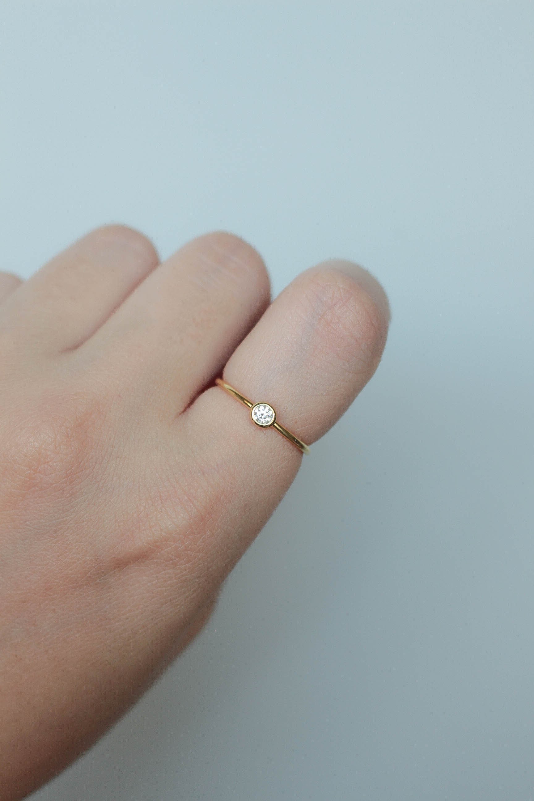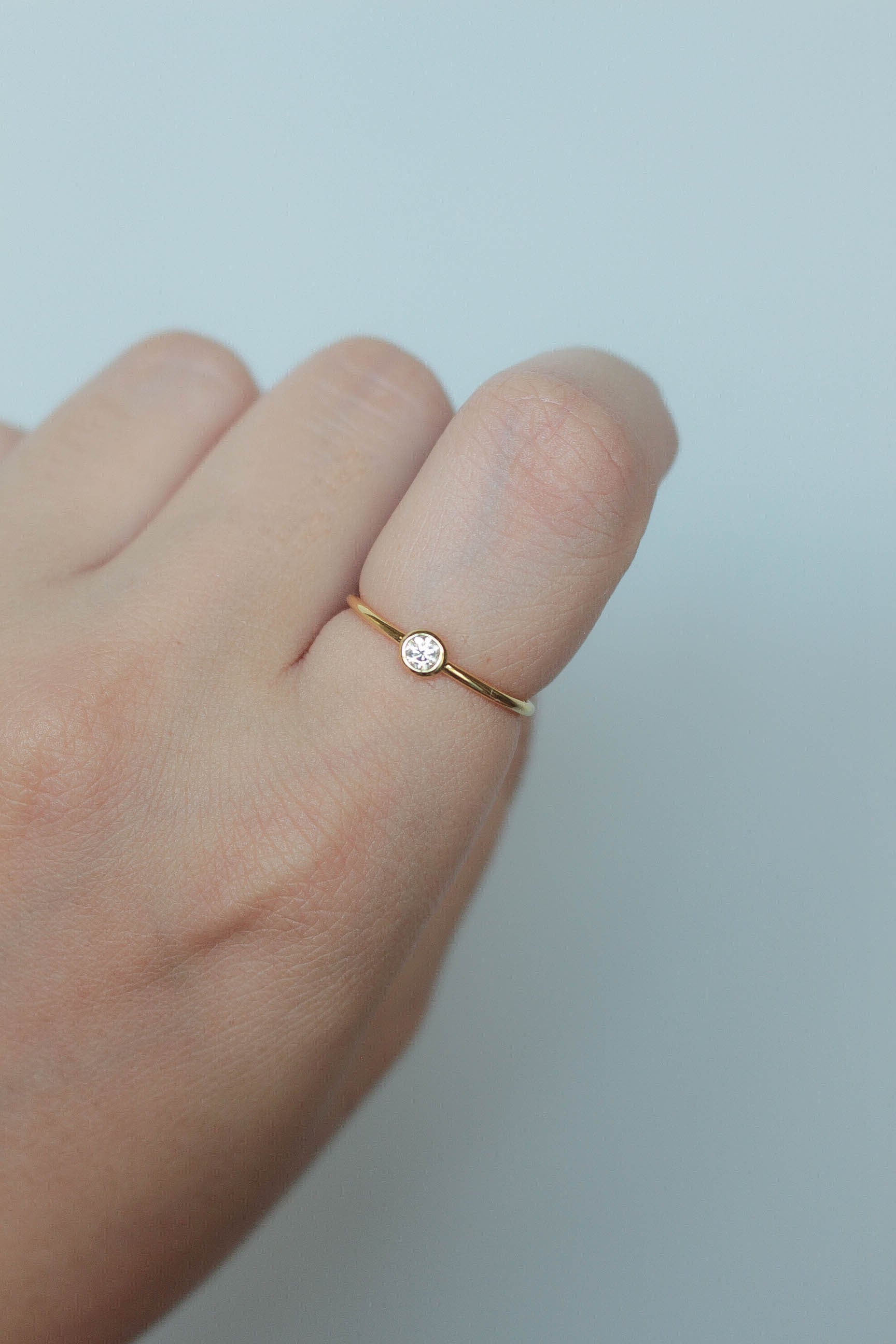 細身のシンプルなフレームに1粒ジルコニアダイヤを埋め込んだミニマルなリング。