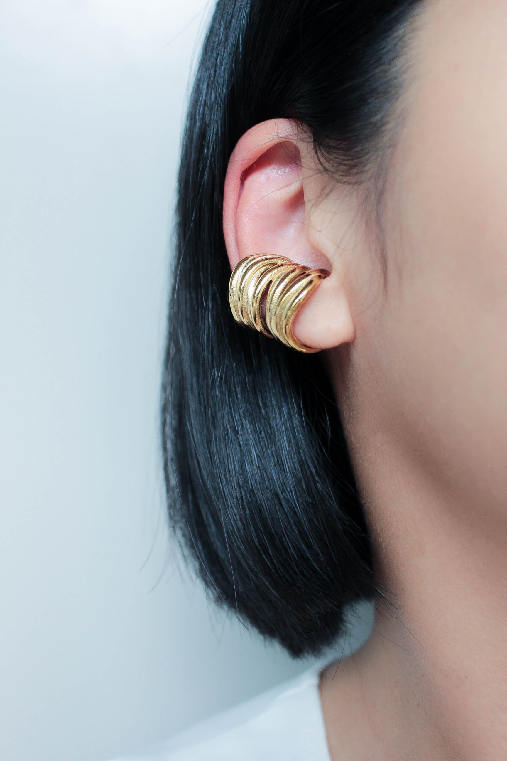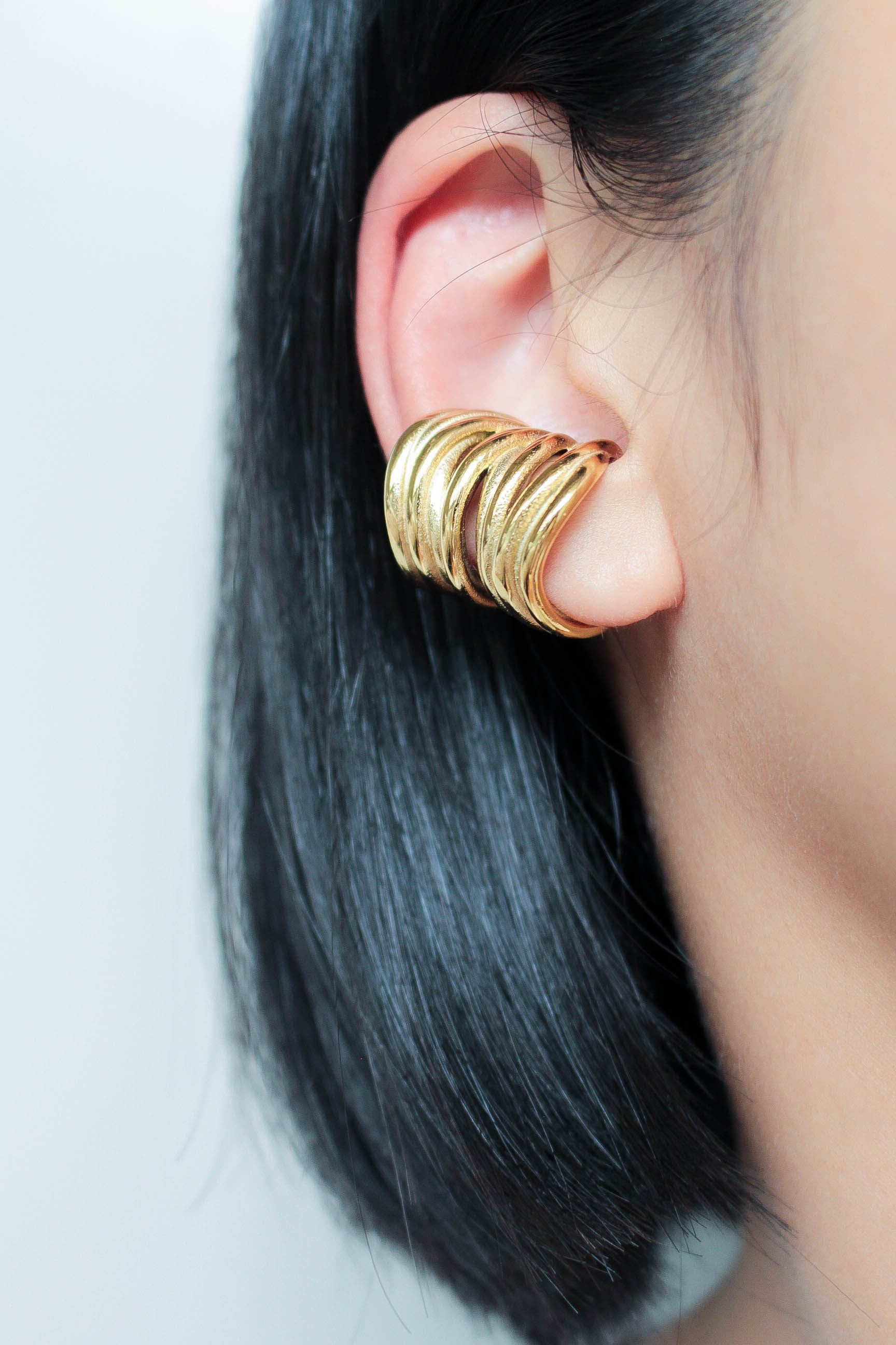 耳を覆うような螺旋状のデザインが特徴のイヤーカフ。