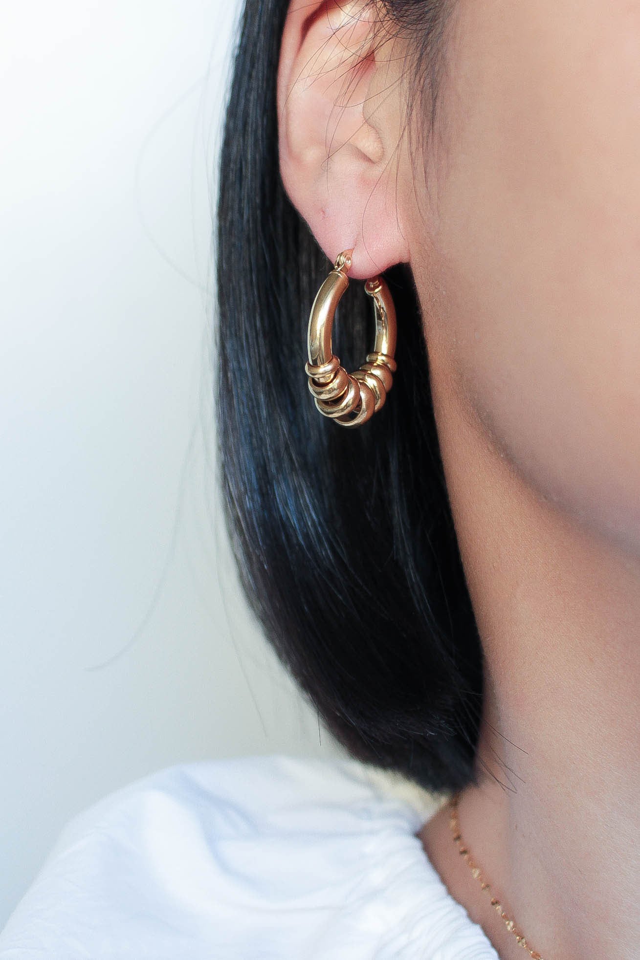 リズミカルに重なるリングモチーフが印象的なフープピアス。