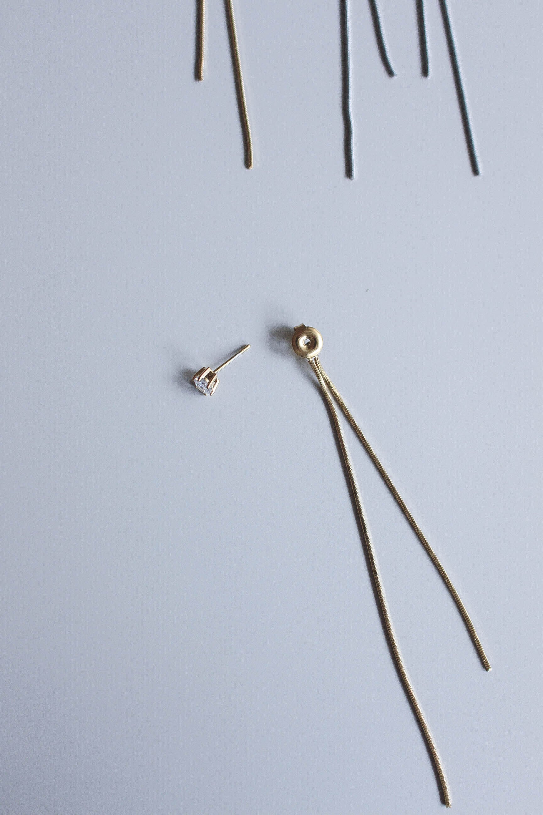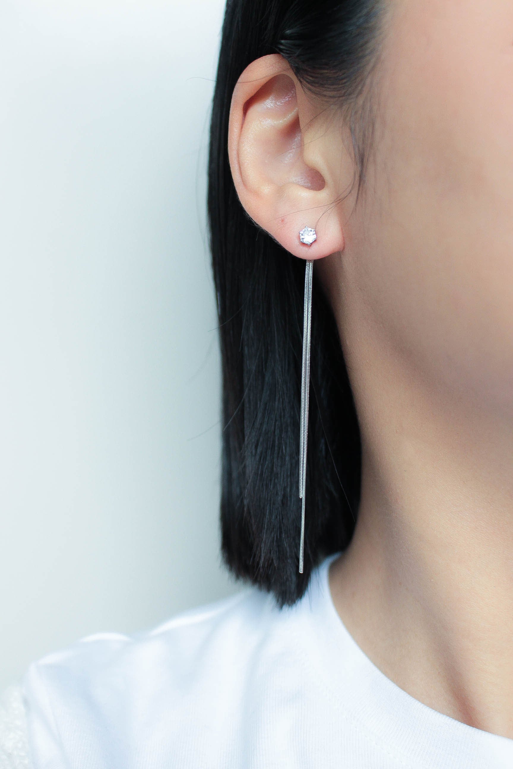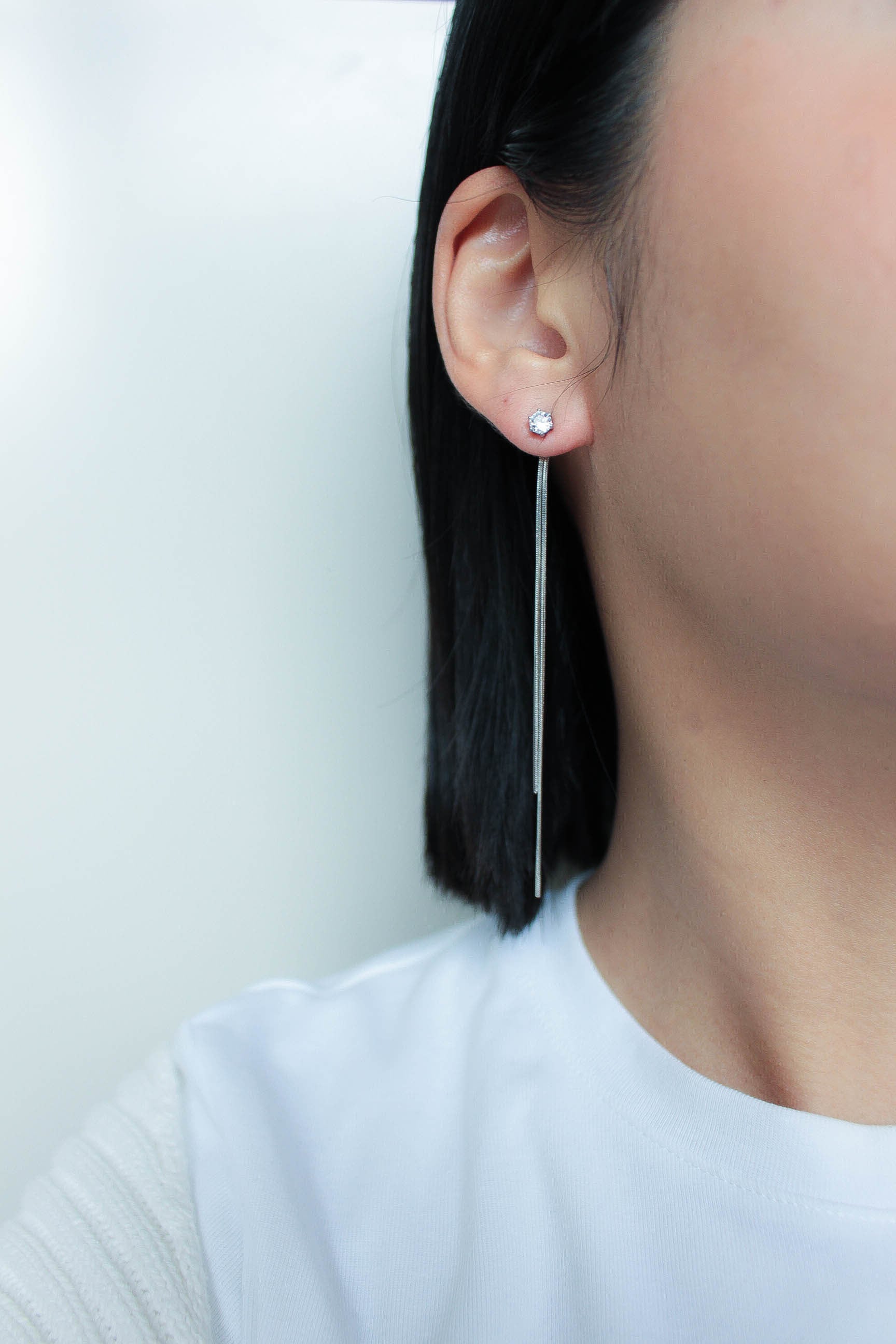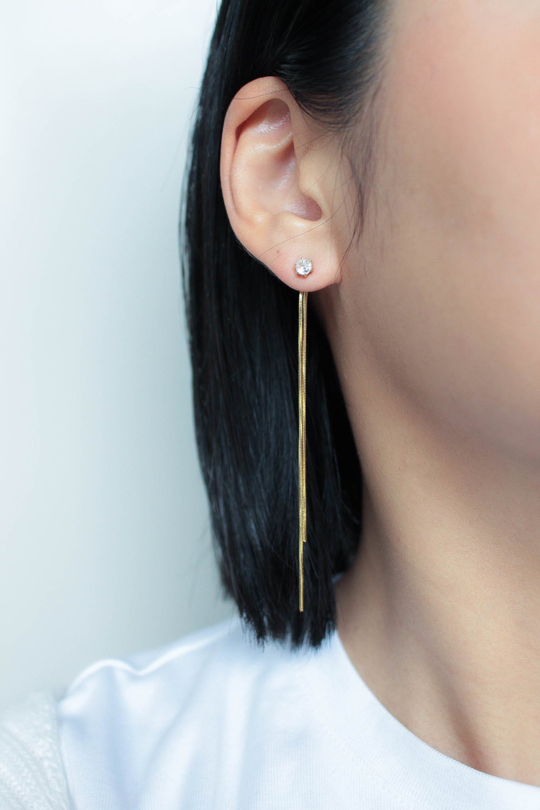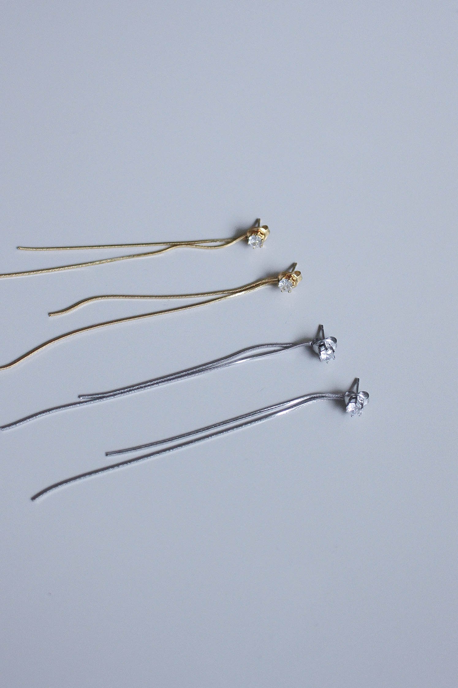 繊細なチェーンが軽やかに揺れる、1粒ダイヤとチェーンデザインをMIXさせた耳元を上品に彩るロングピアス。