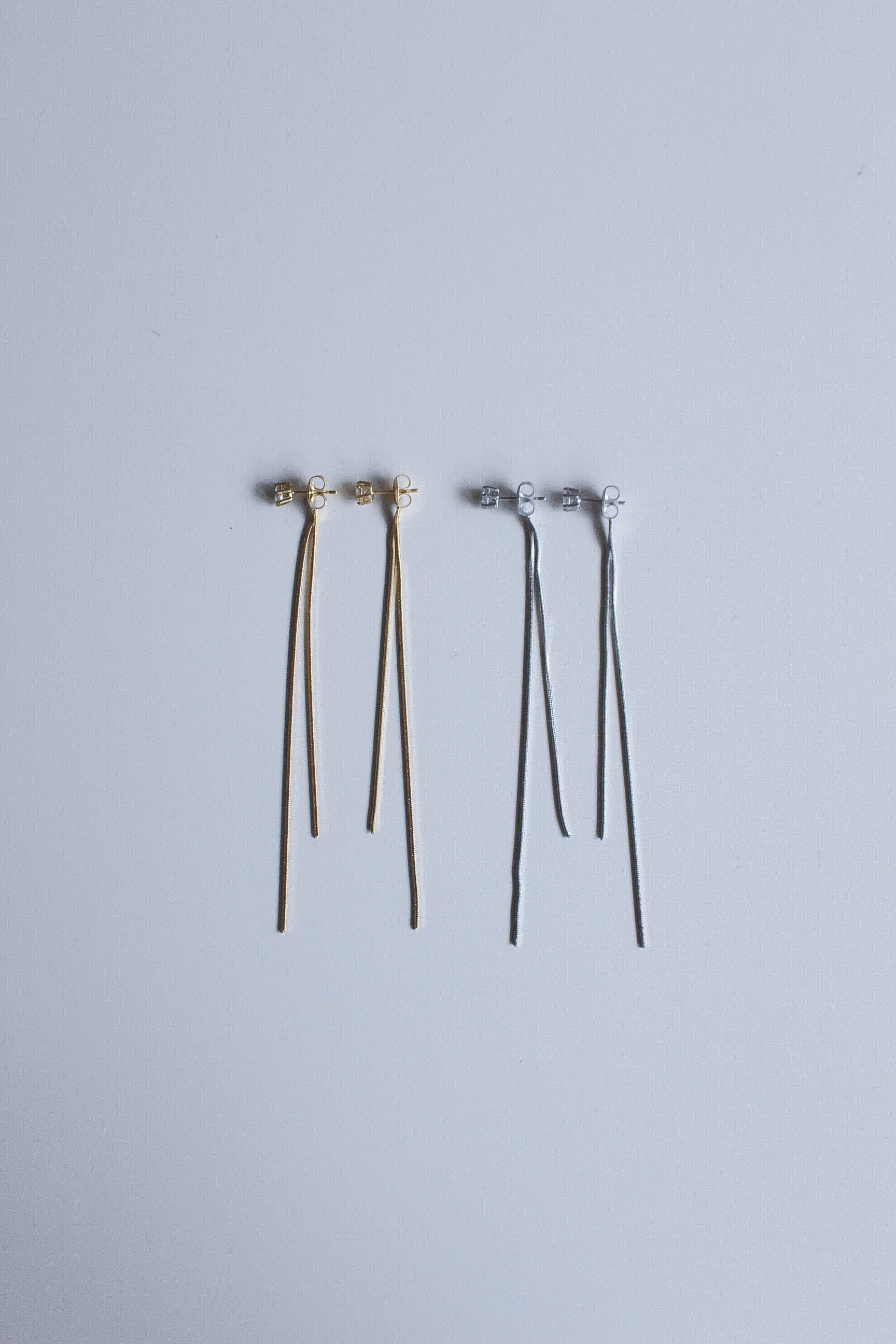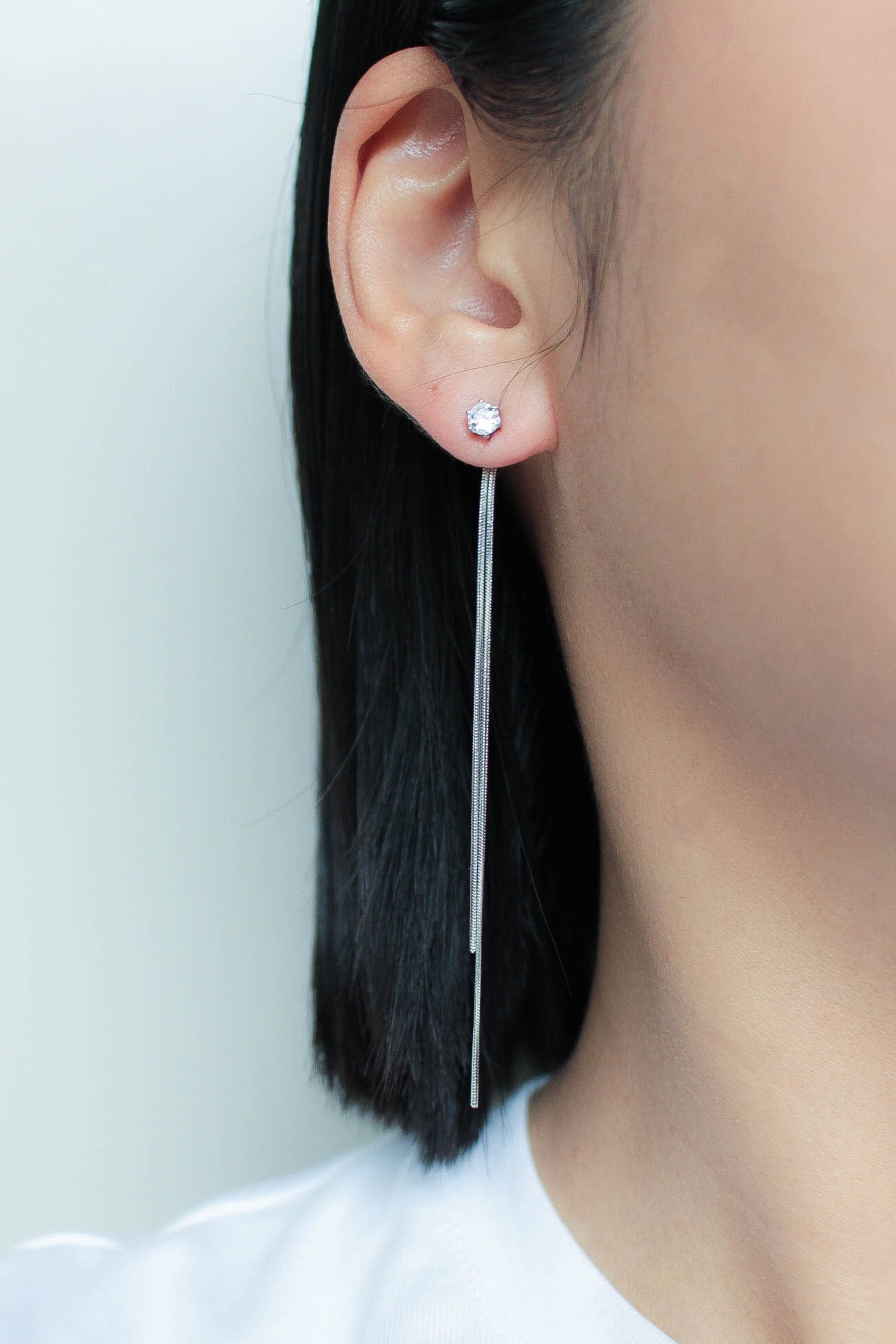 すらりと伸びるバーラインと細やかなチェーンが描く縦のシルエットは、顔まわりをすっきりと見せてくれます。