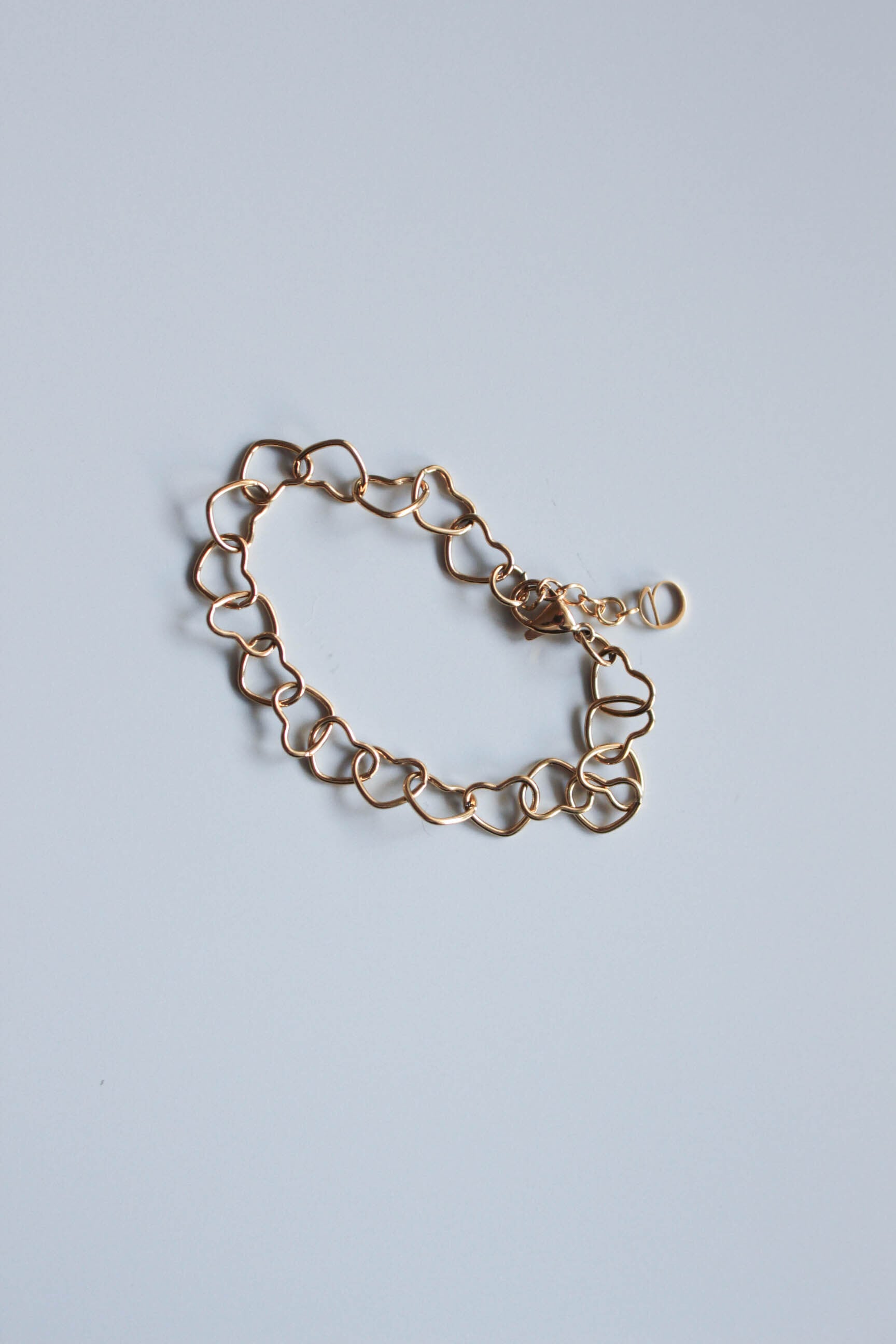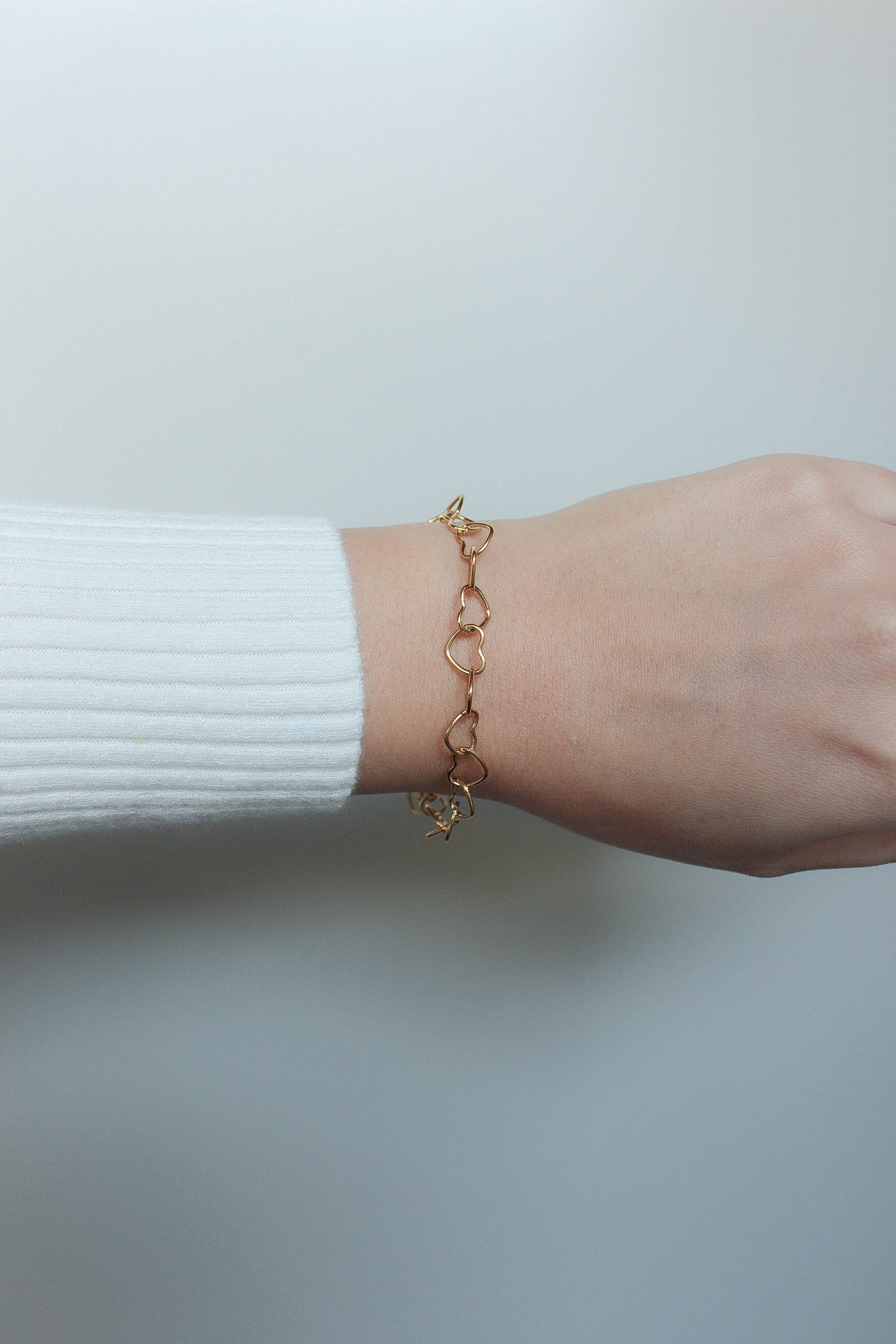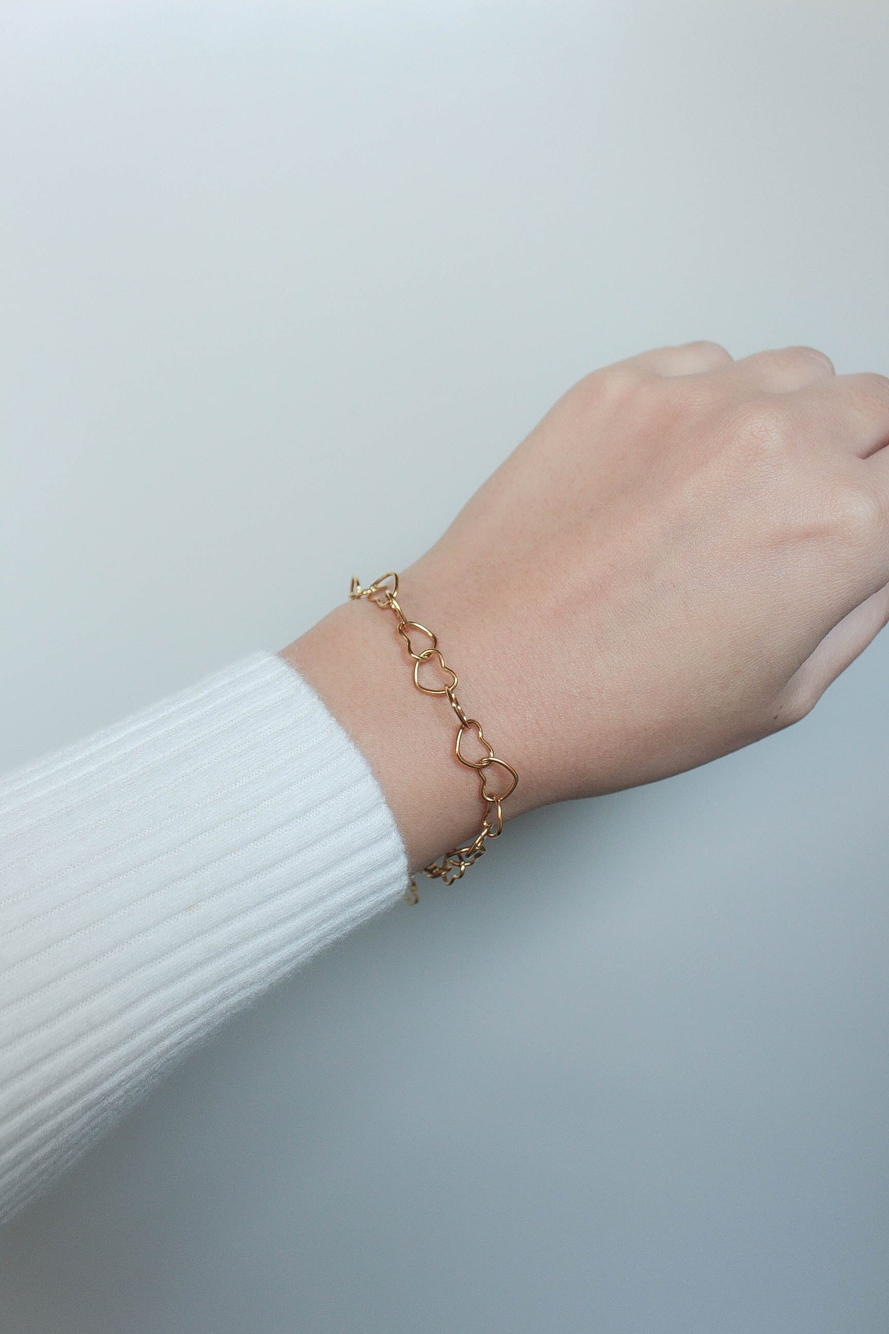 動くたびに軽やかに揺れるハートが、さりげなく女性らしさを引き立ててくれるブレスレット。