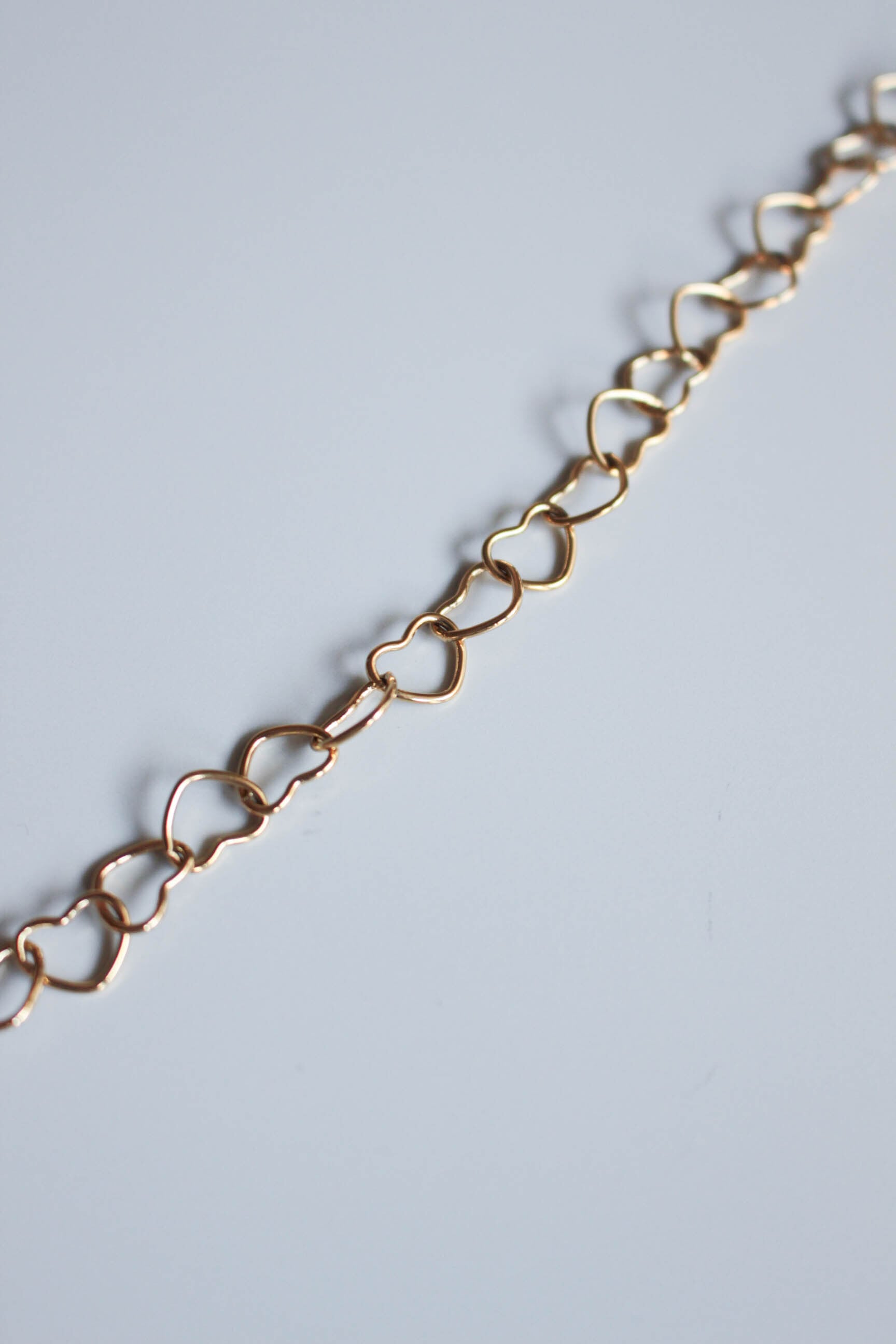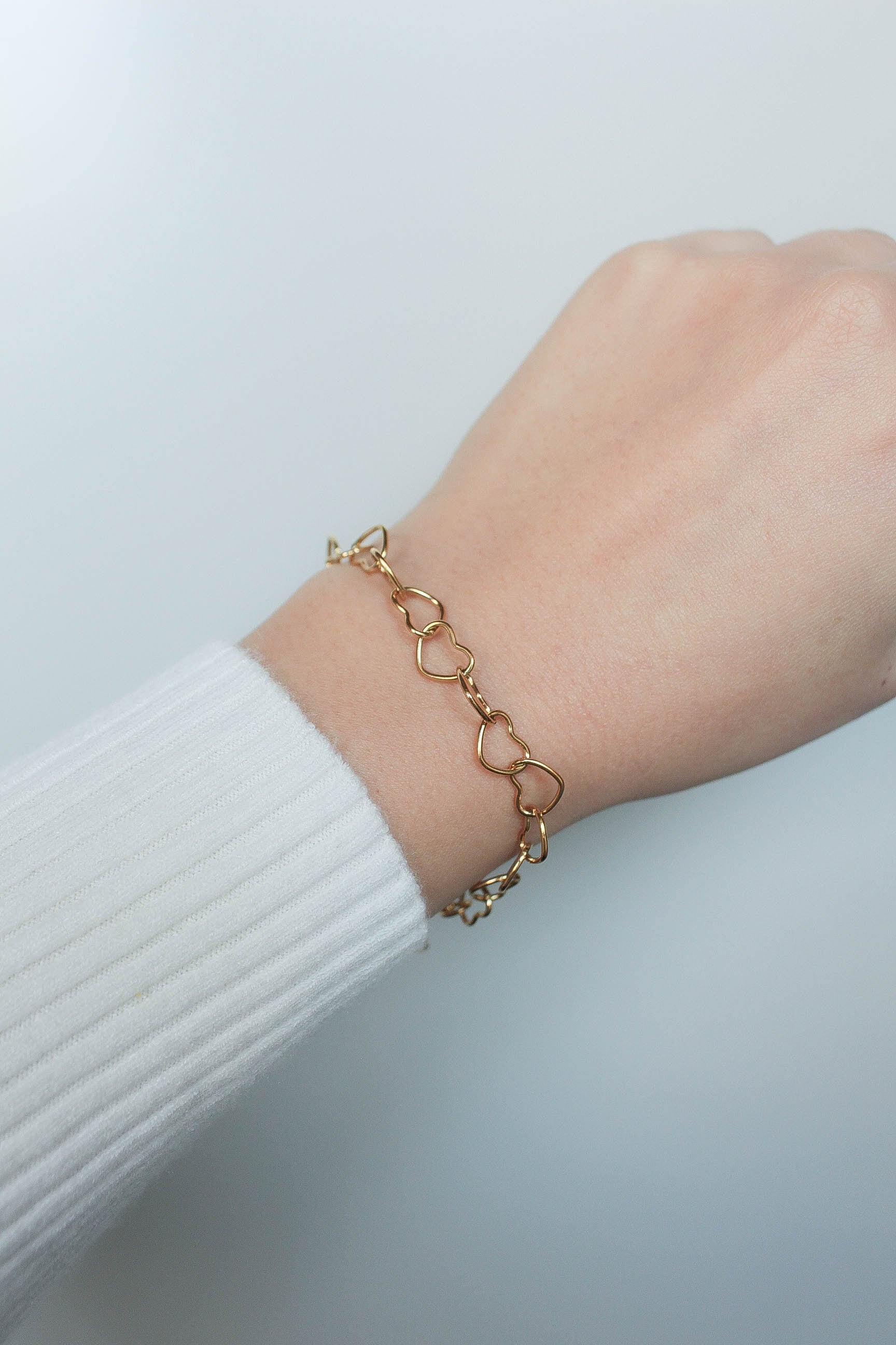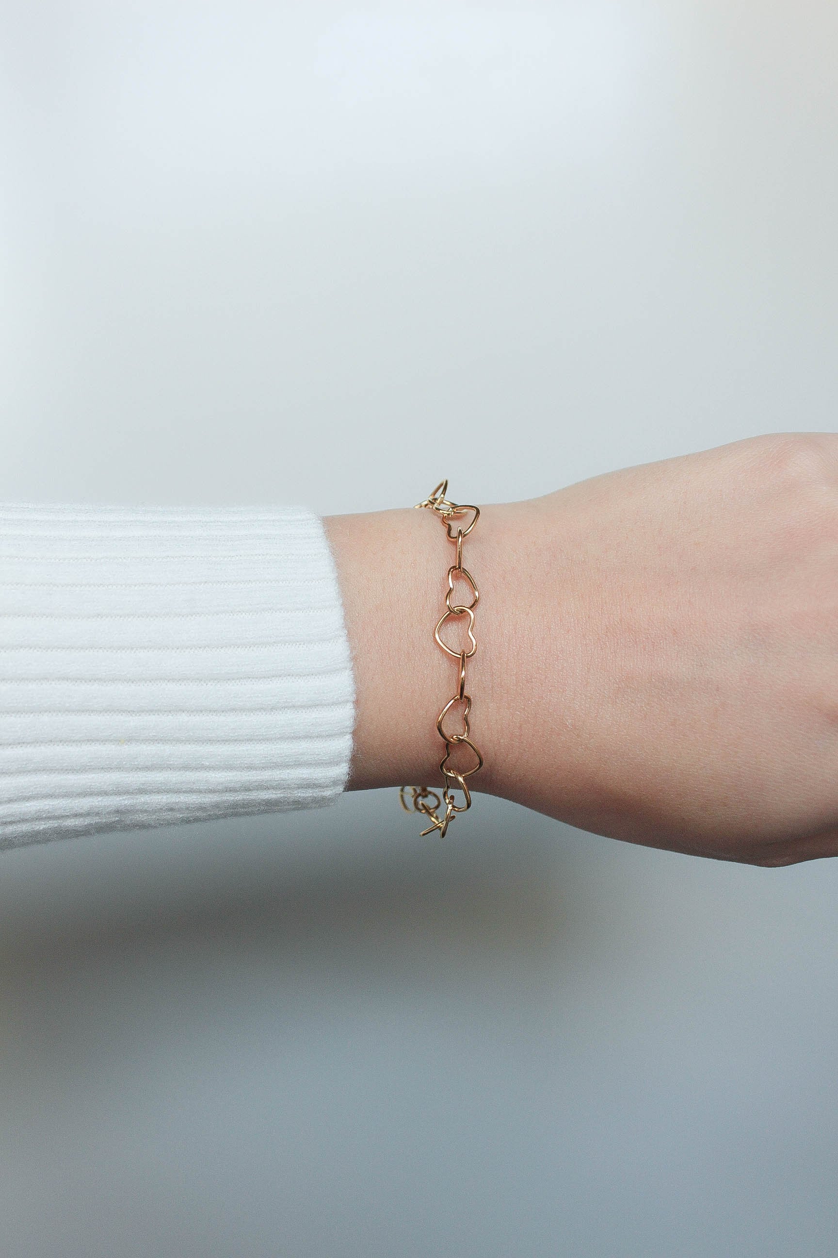 動くたびに軽やかに揺れるハートが、さりげなく女性らしさを引き立ててくれるブレスレット。