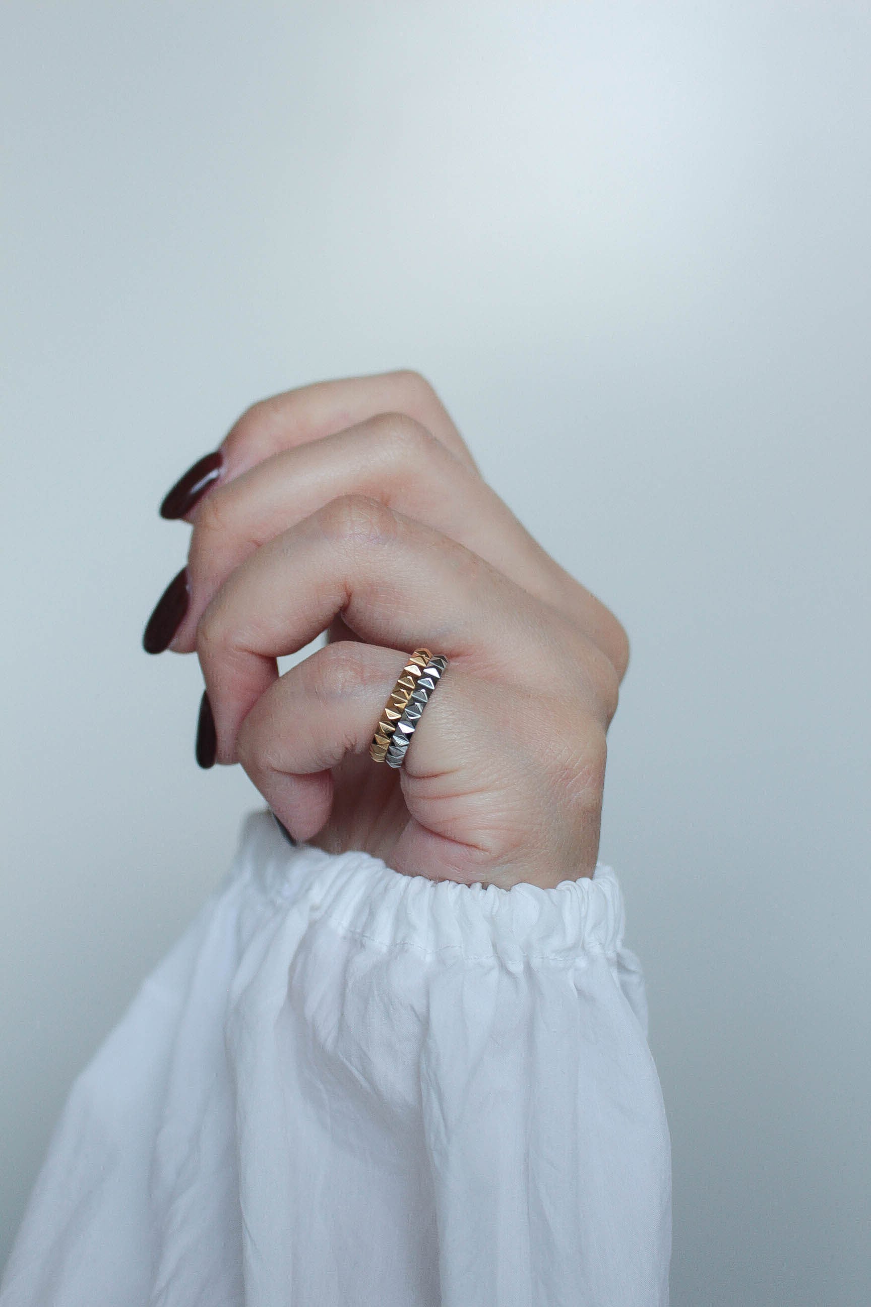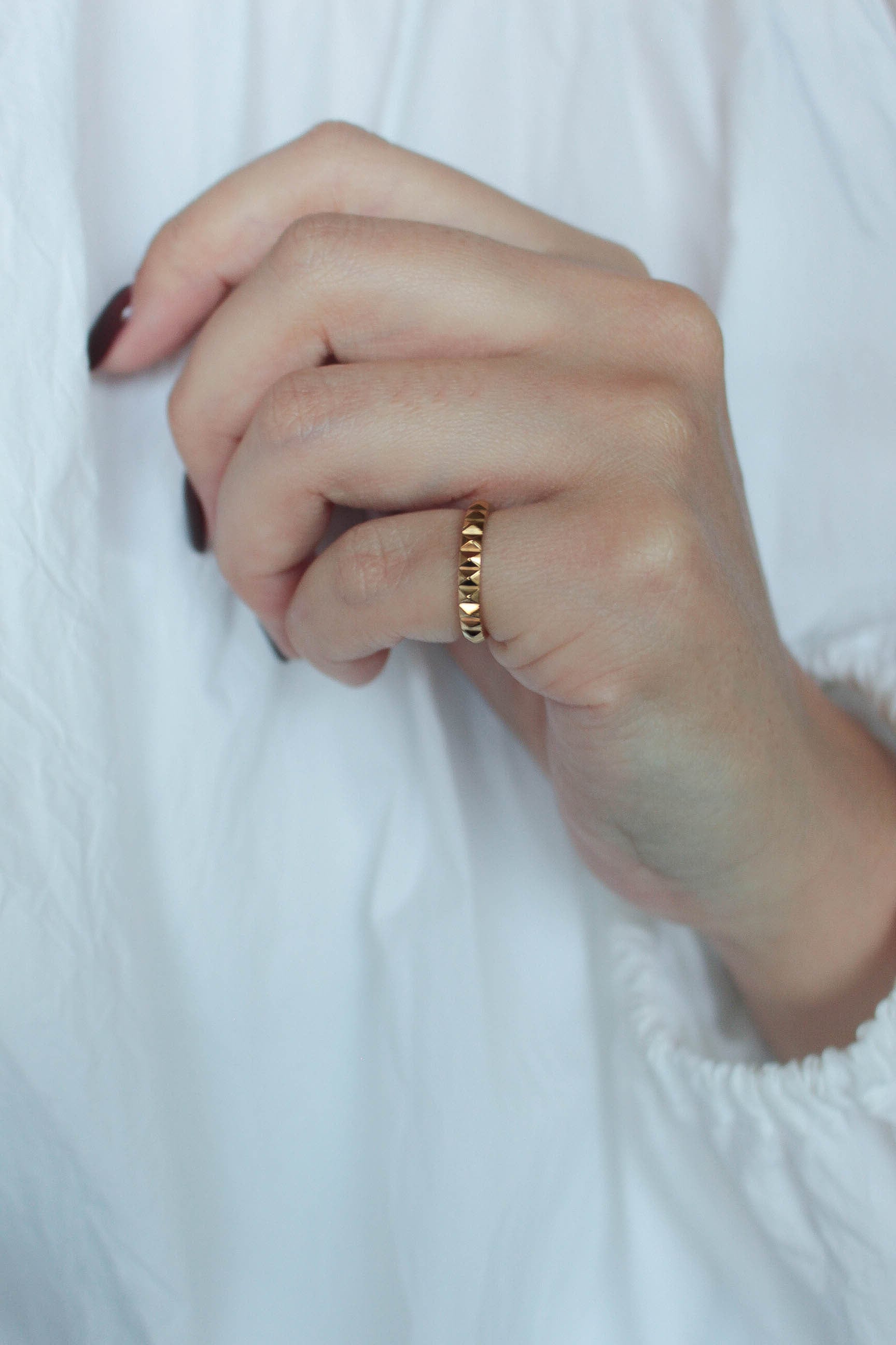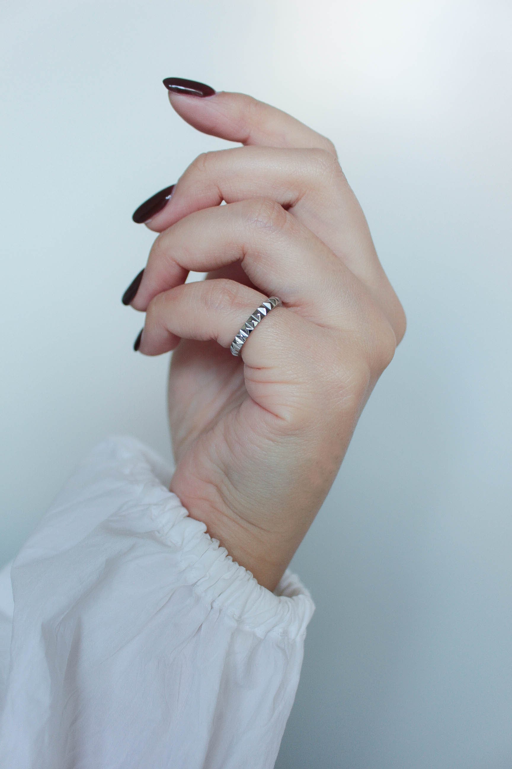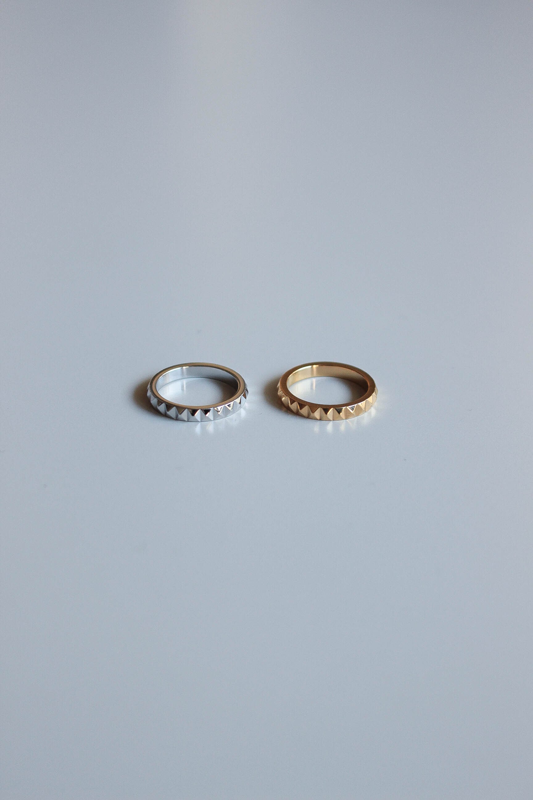 全周にわたる丸みの帯びたエタニティタイプのスタッズは多面的なデザインで光をあらゆる角度から反射するので、キラキラと輝き存在感があります。エッジの効いたデザインですが細身フレームのため洗練された指先に。着画のように重ね付けでより一層こなれ感がでるお洒落リングです。