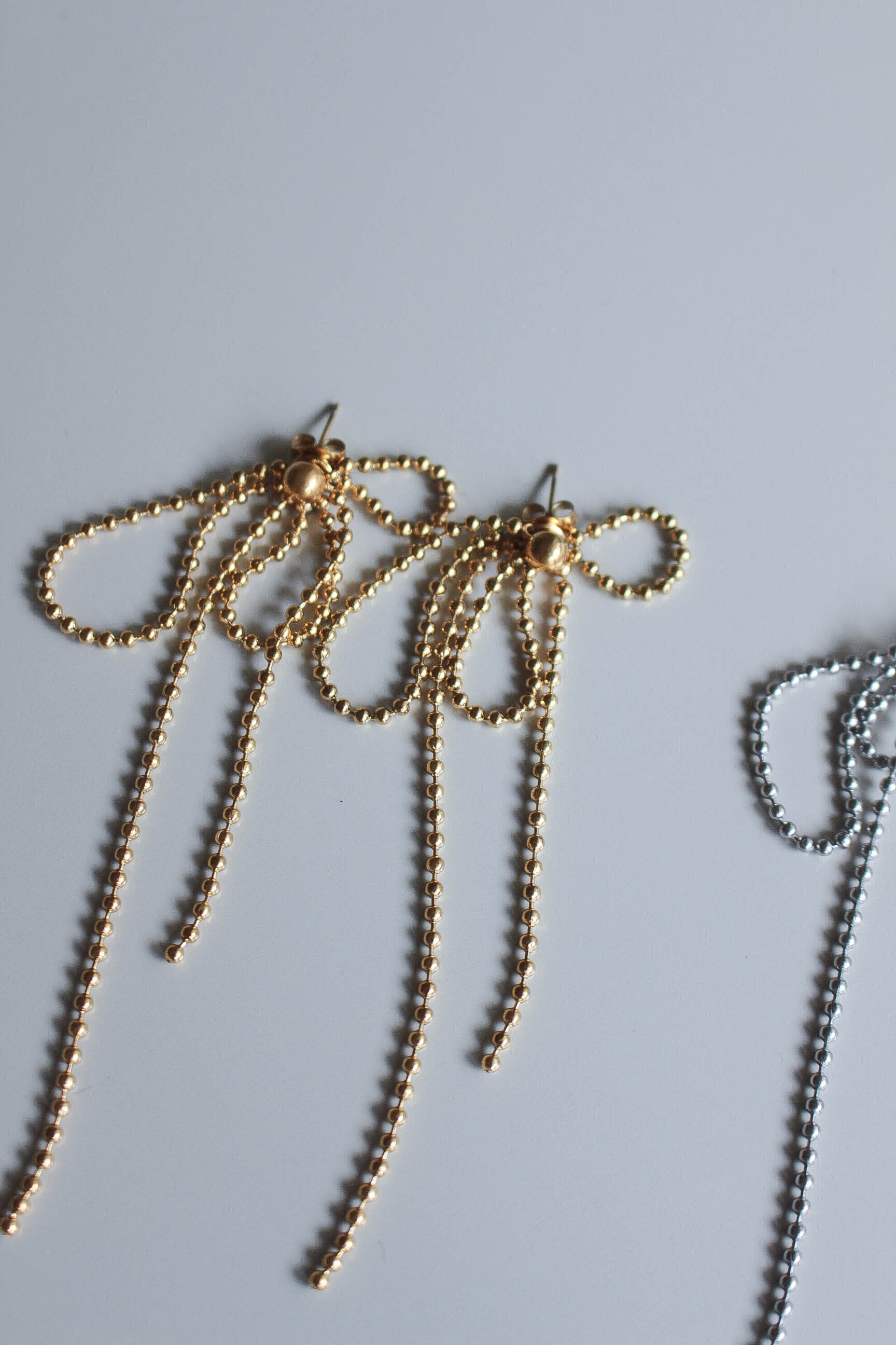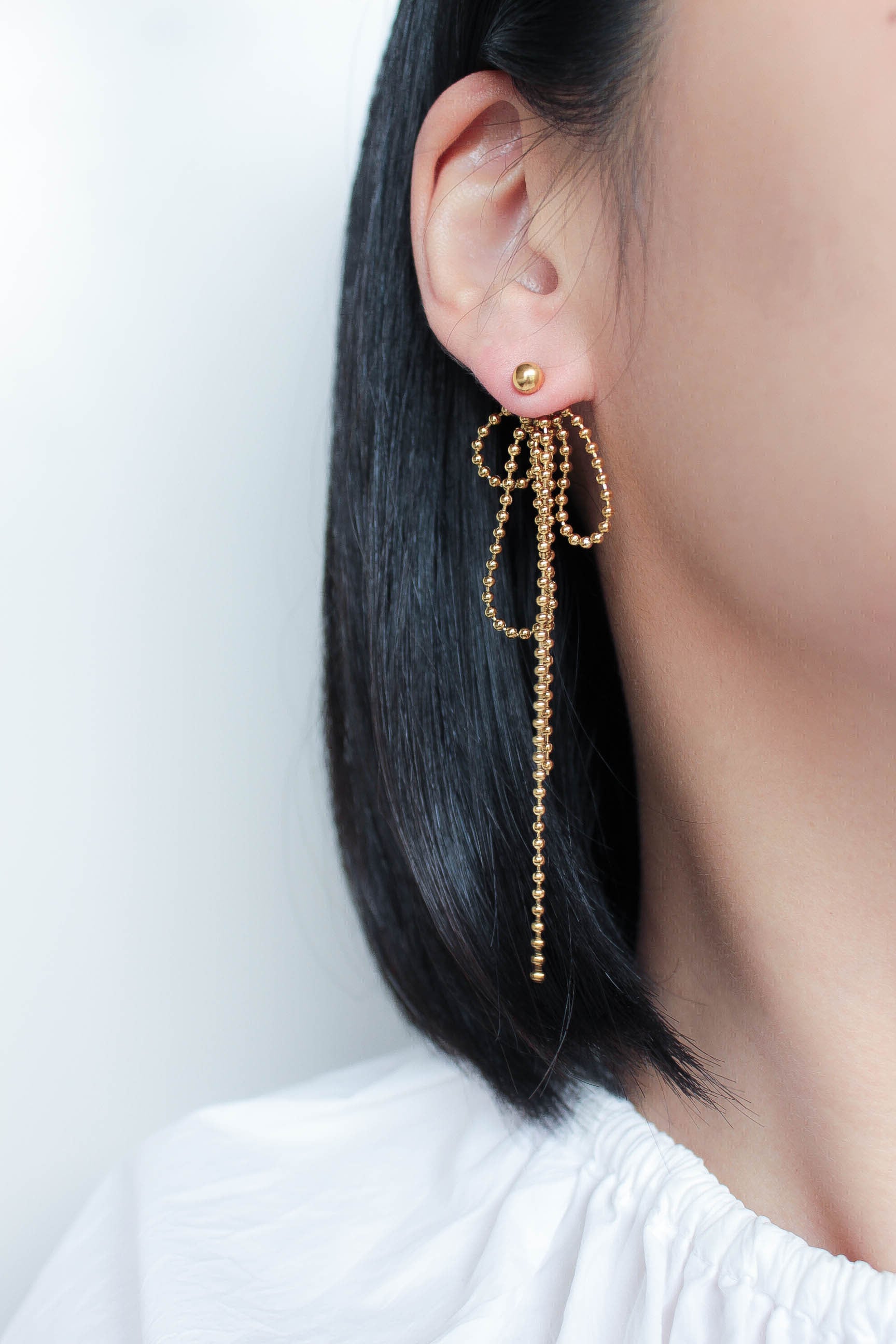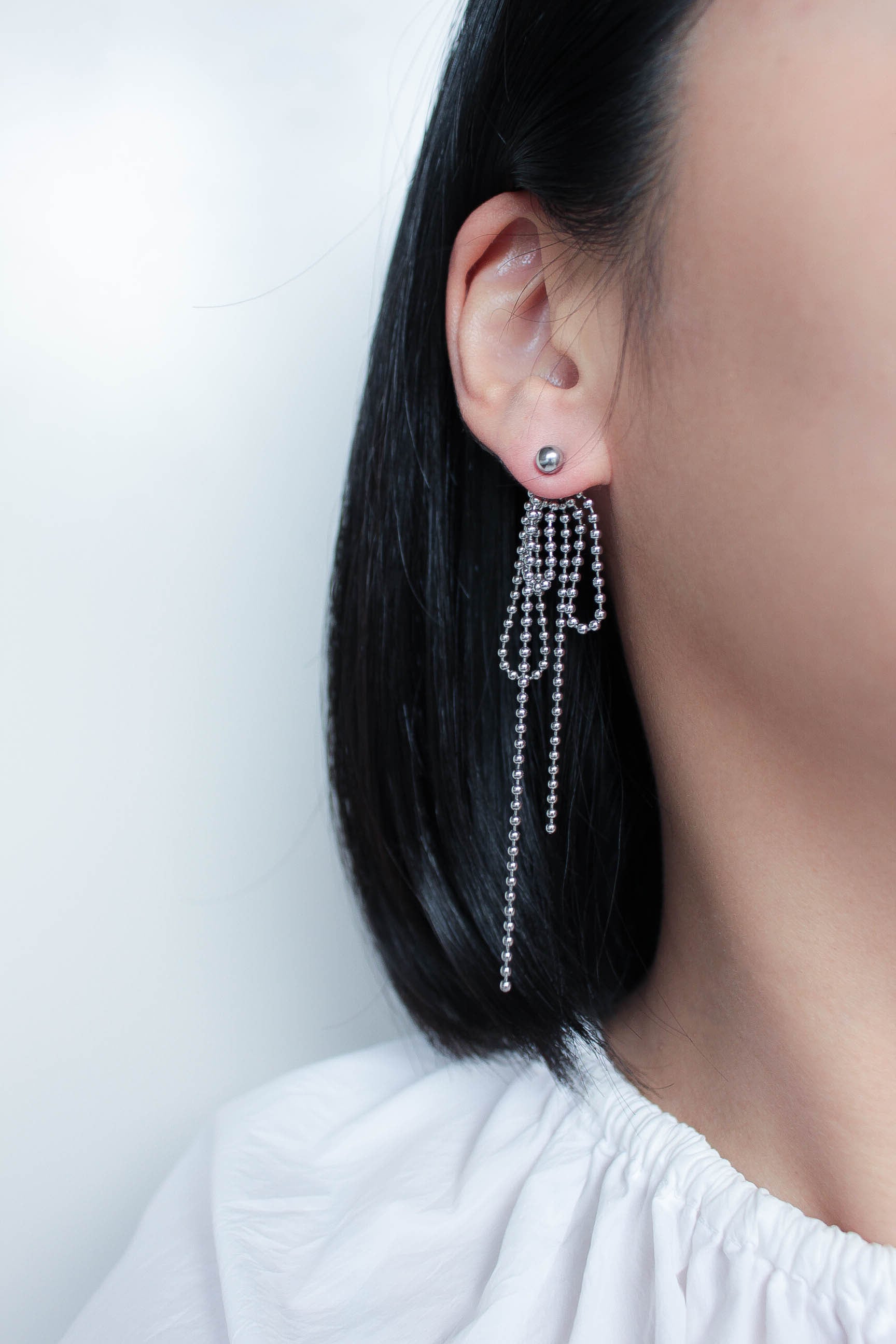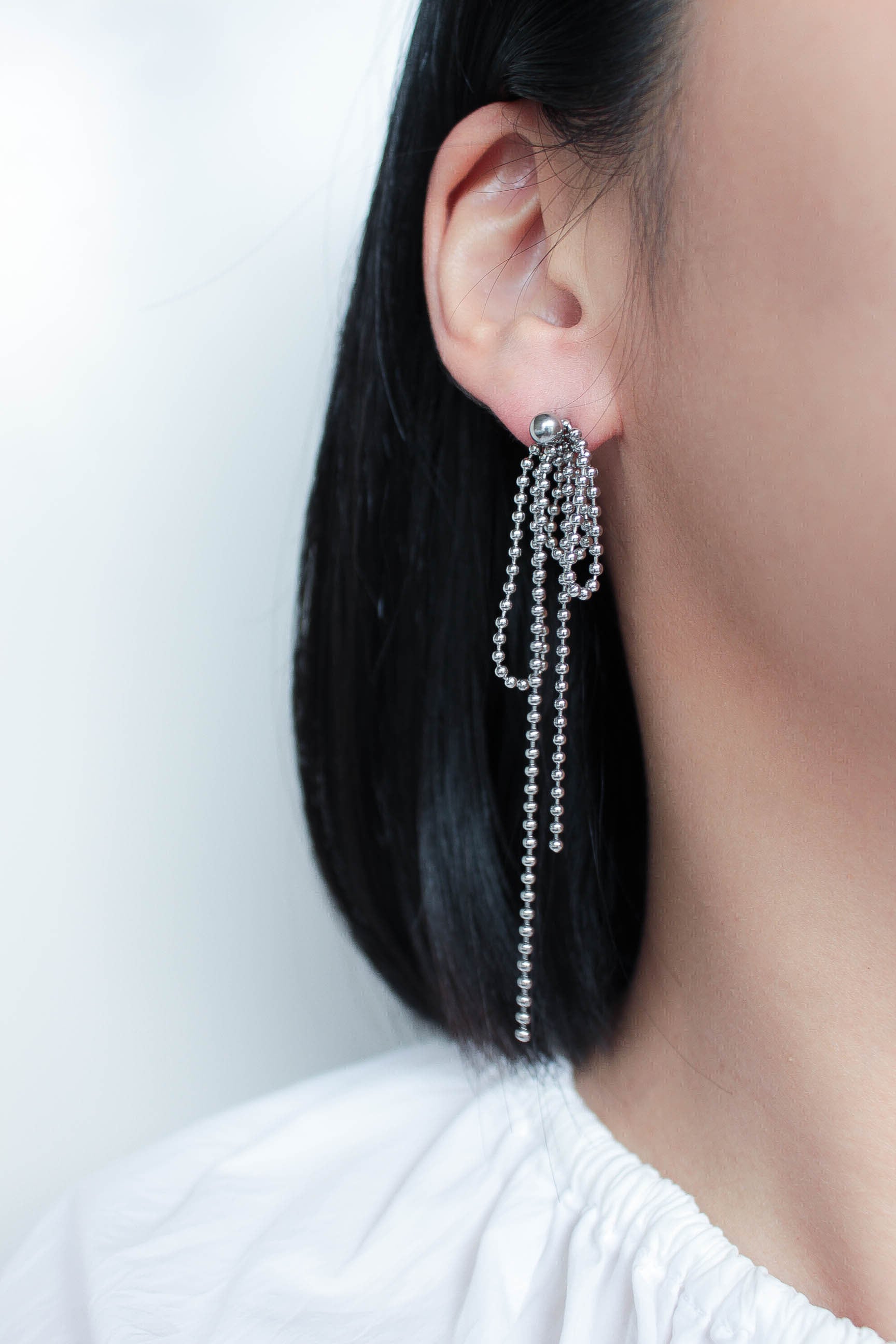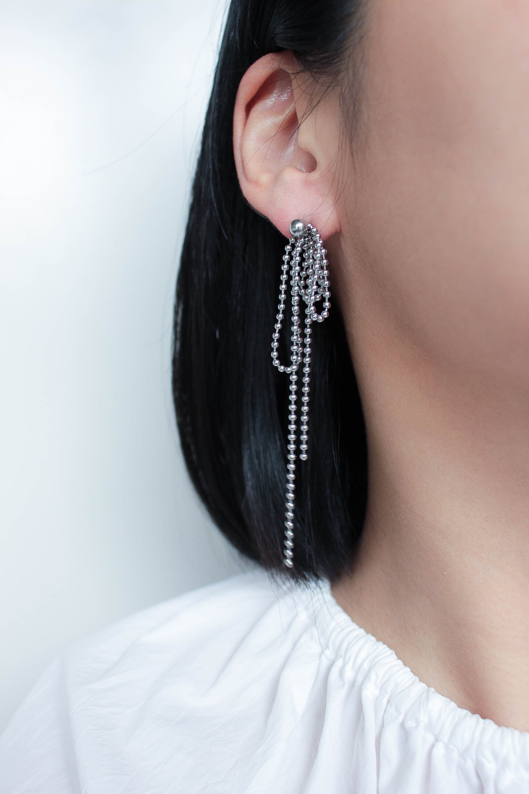 細かなボールチェーンがゆれる、モードなロングフリンジピアス。