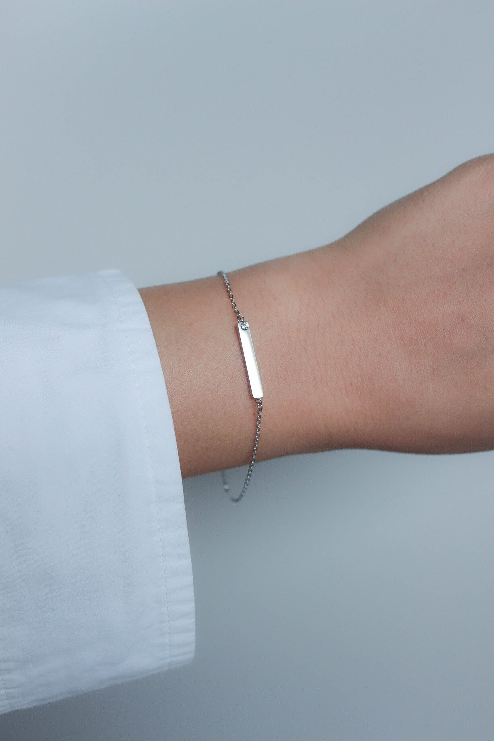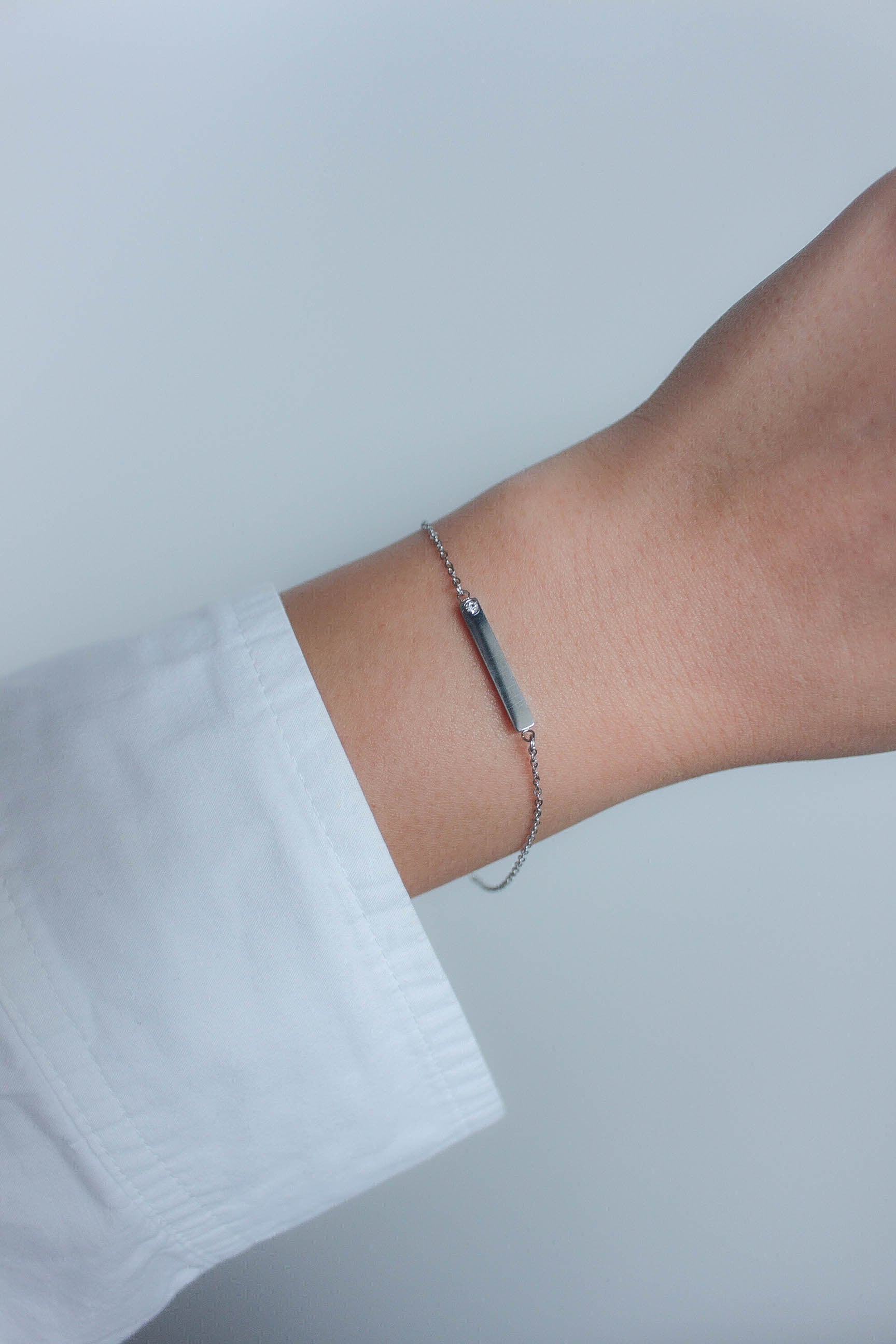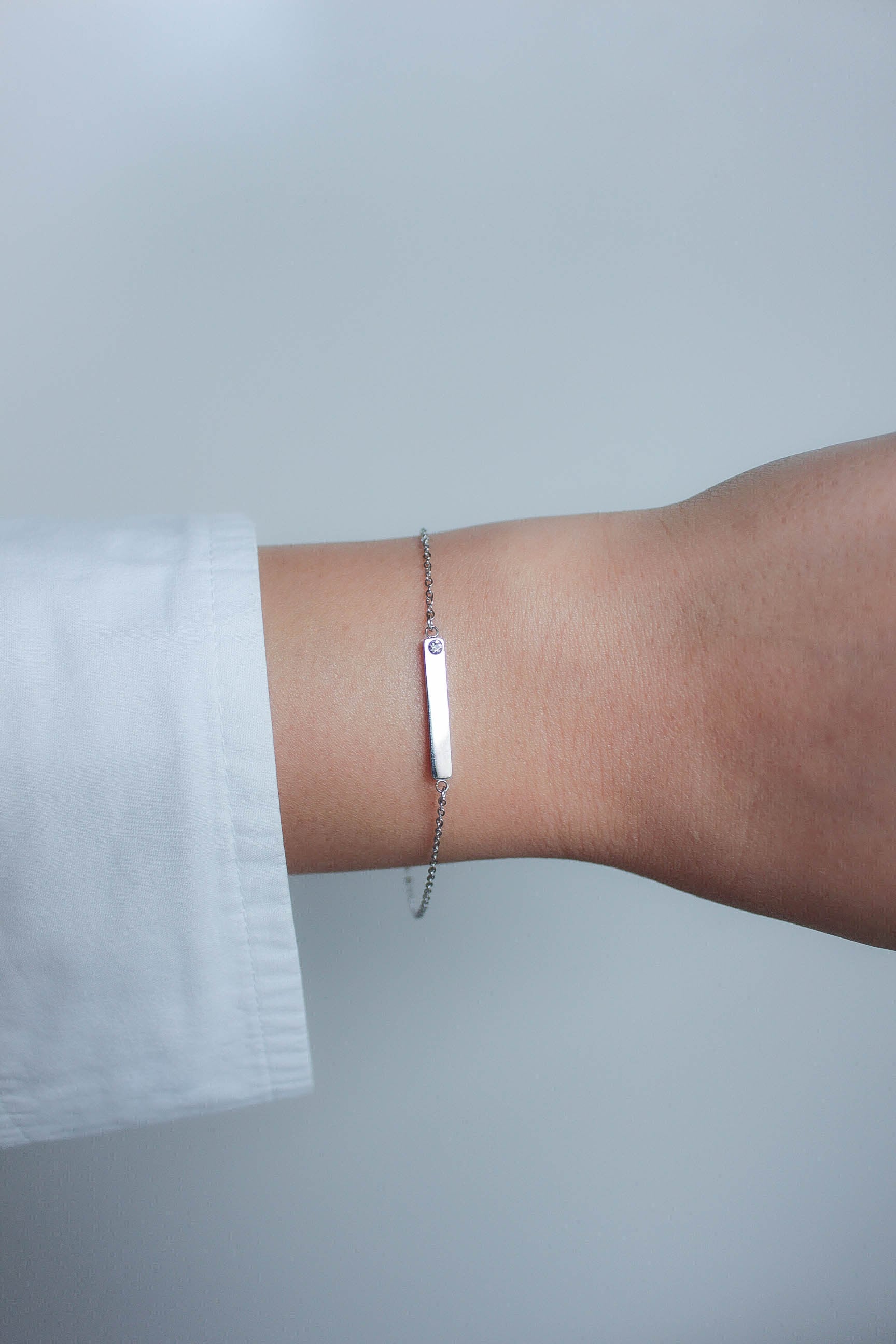 定番のバーモチーフに、さりげなく輝くジルコニアをセットしたブレスレット。