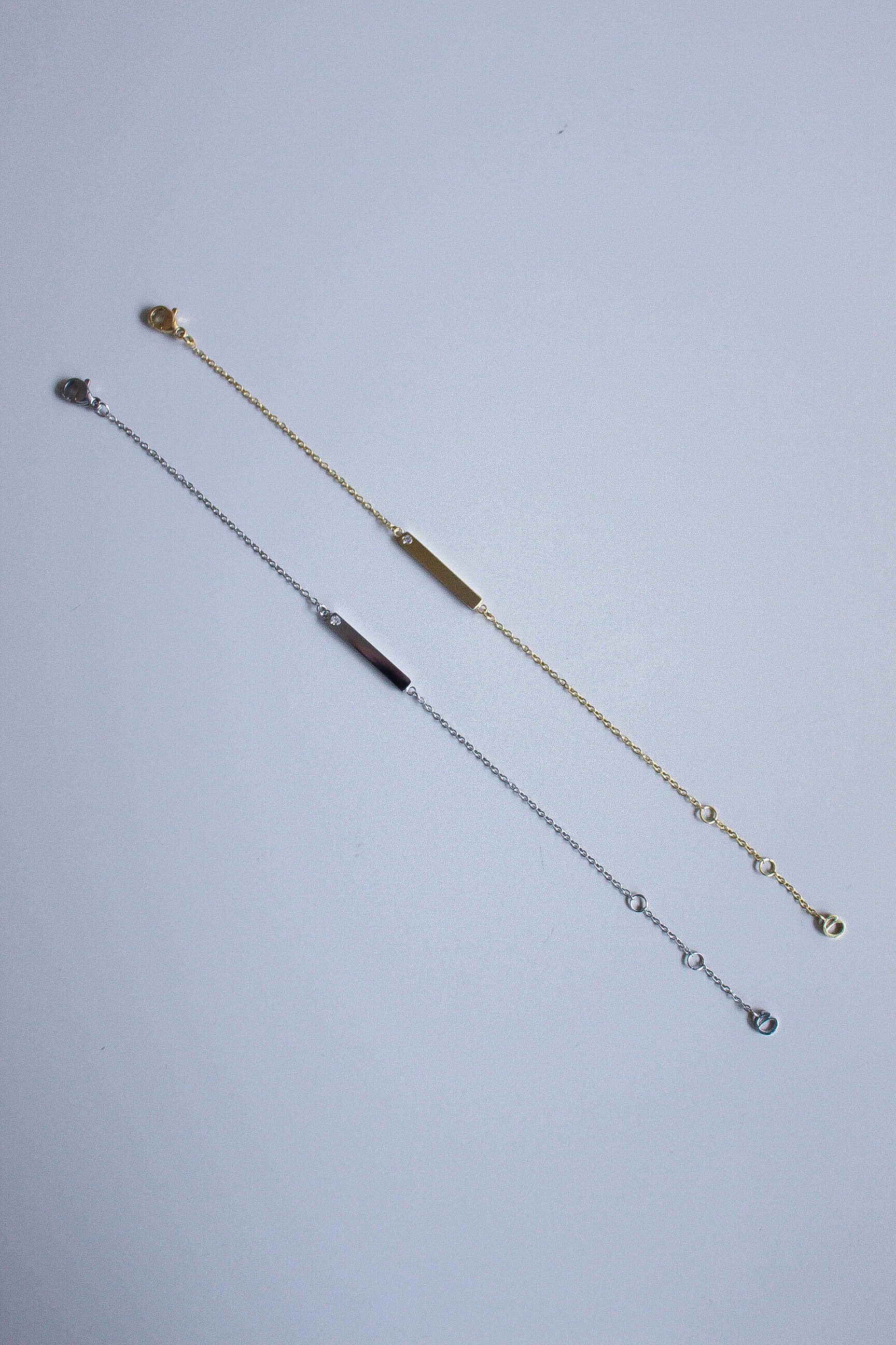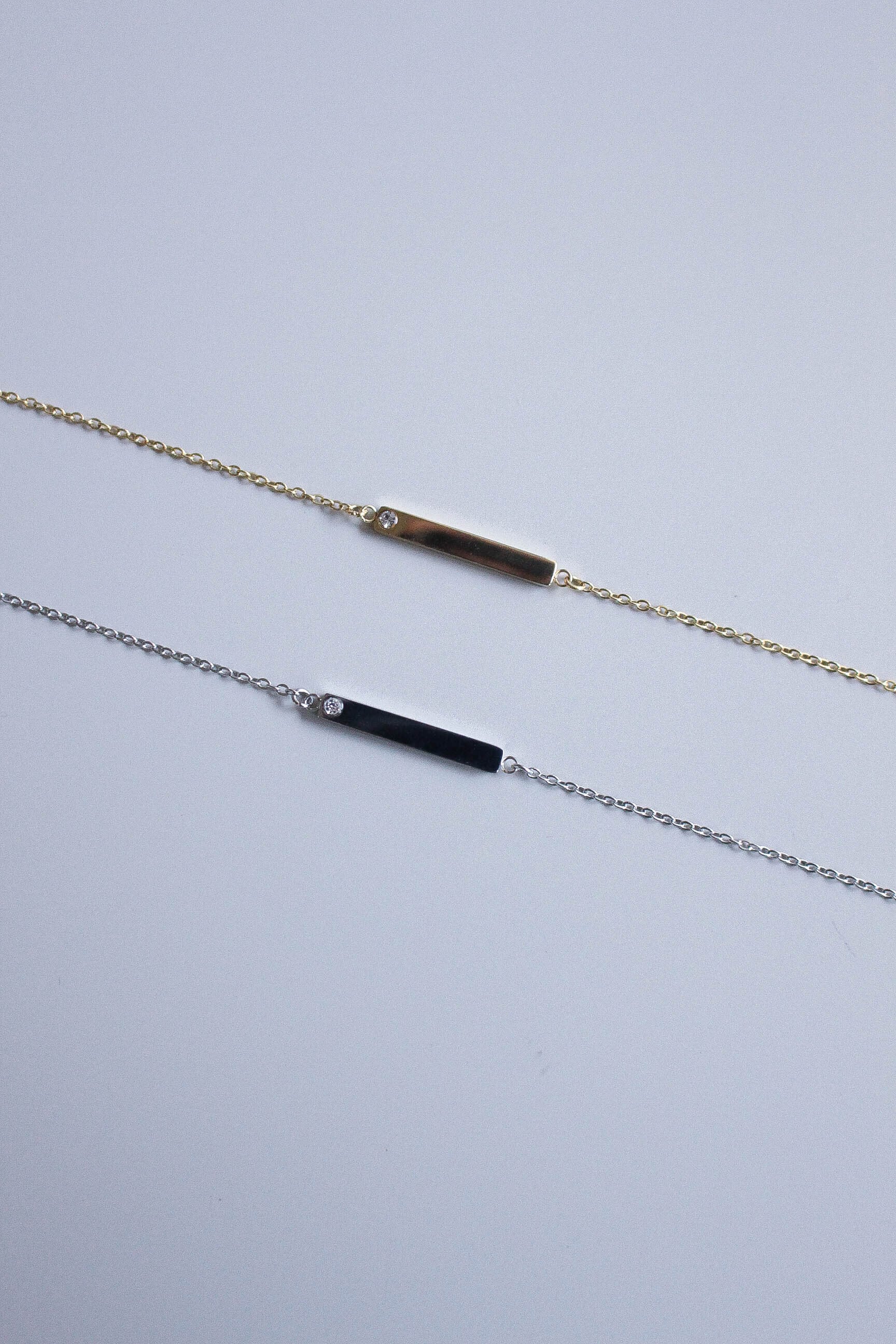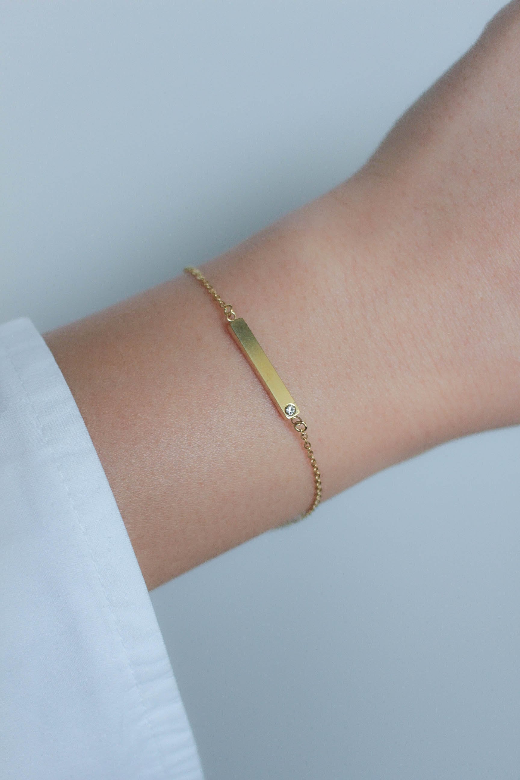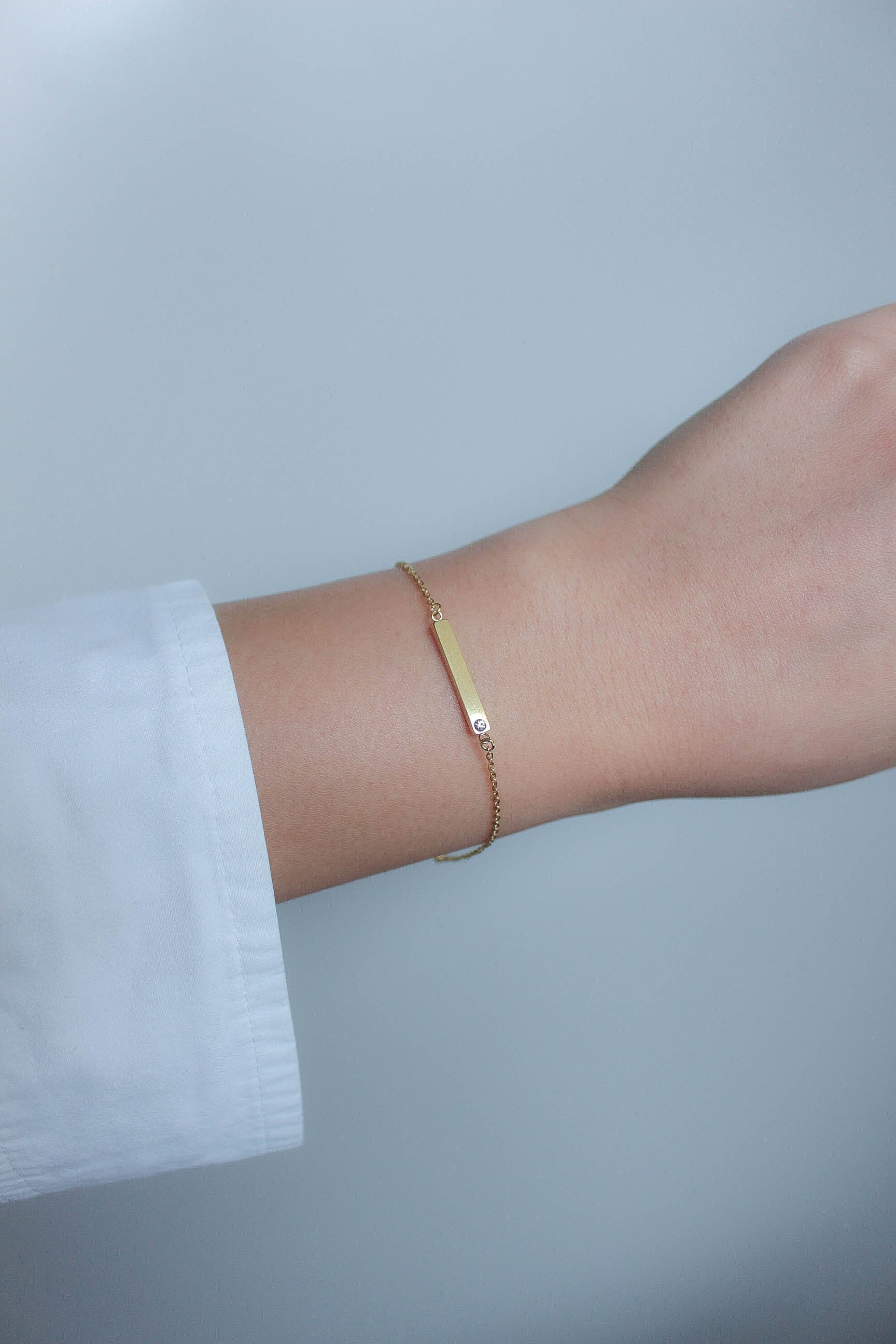 定番のバーモチーフに、さりげなく輝くジルコニアをセットしたブレスレット。