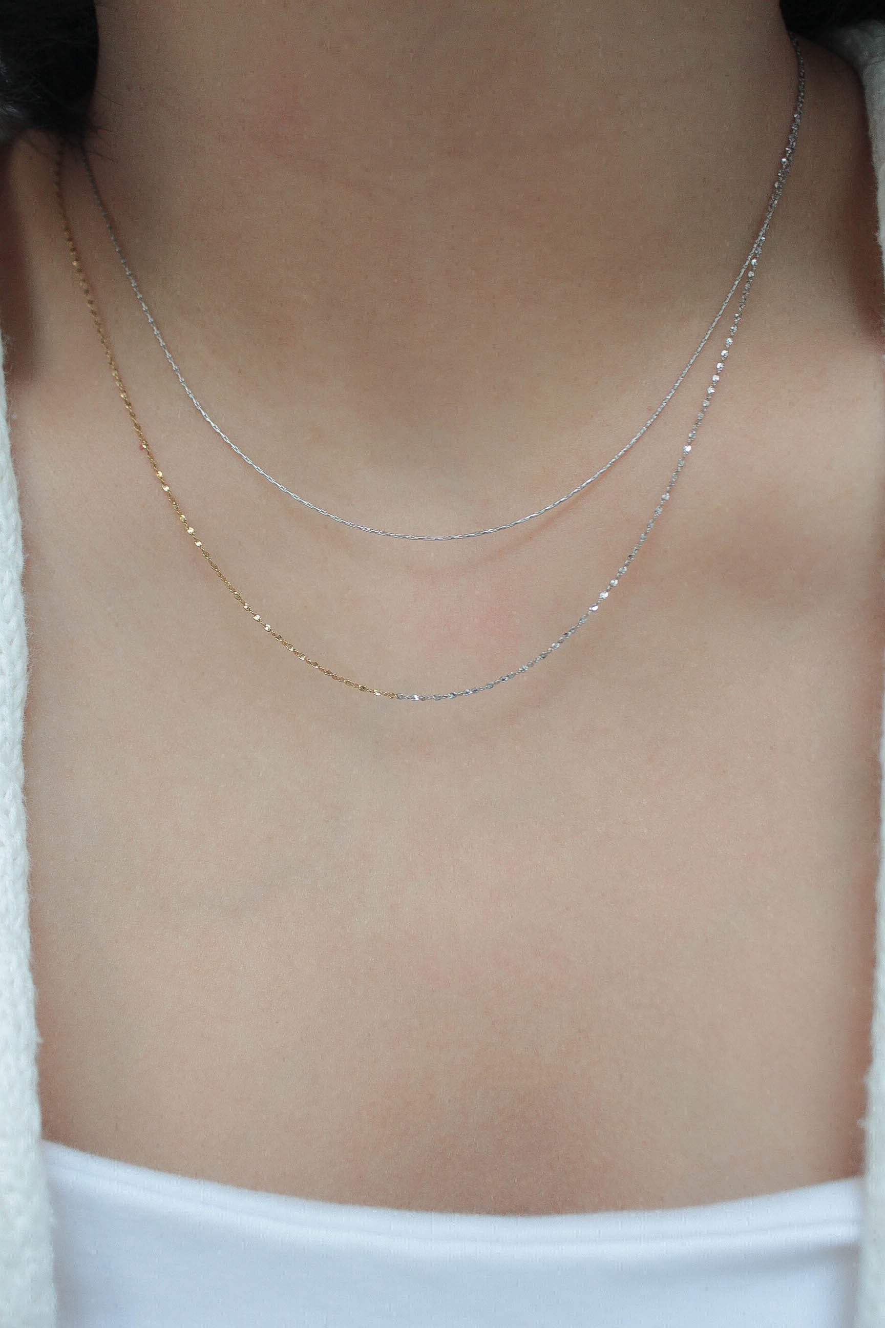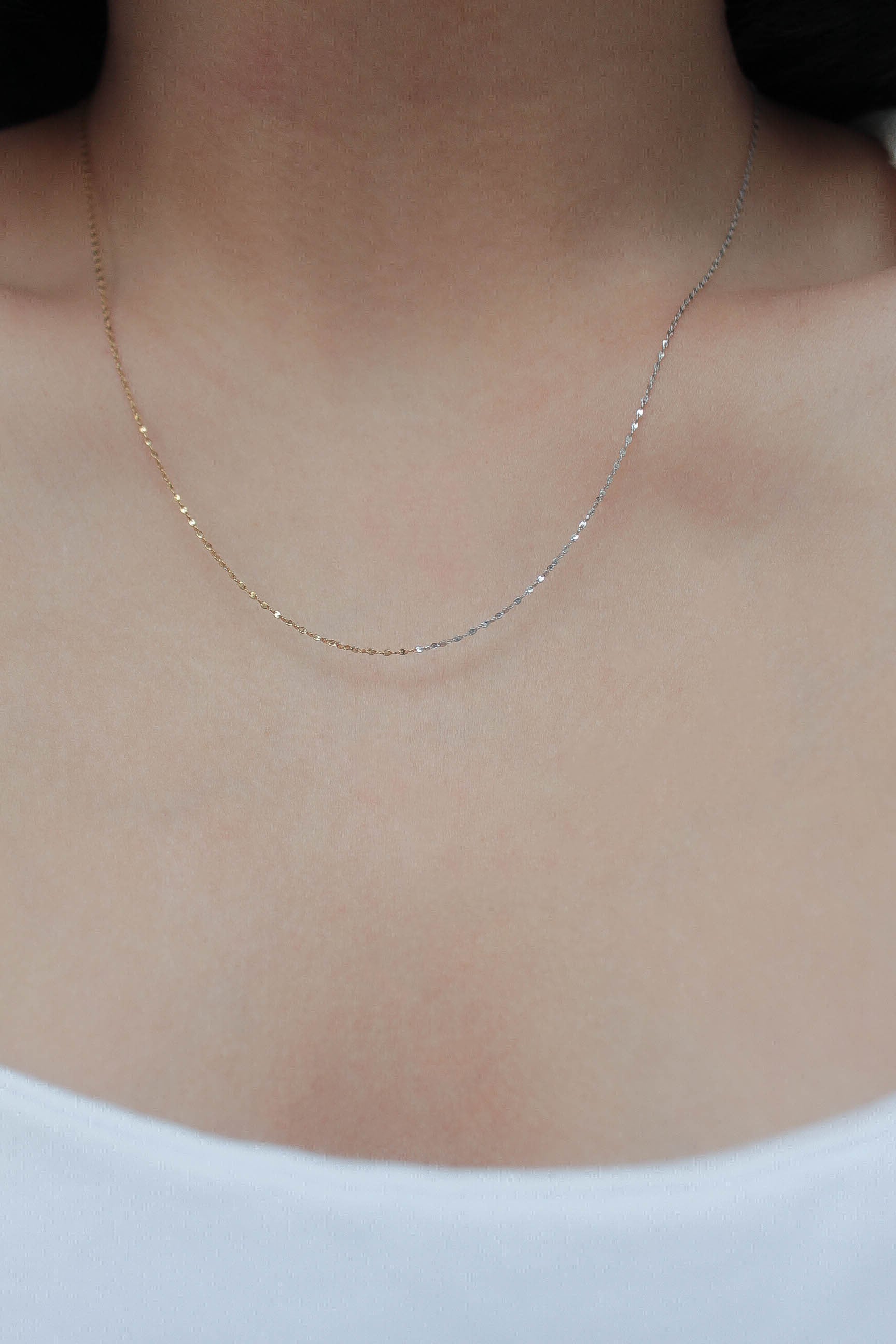 極細シリーズの1mmペタルネックレスです。角度が変わるたびにキラキラと輝き首元が華やぐアイテムです。