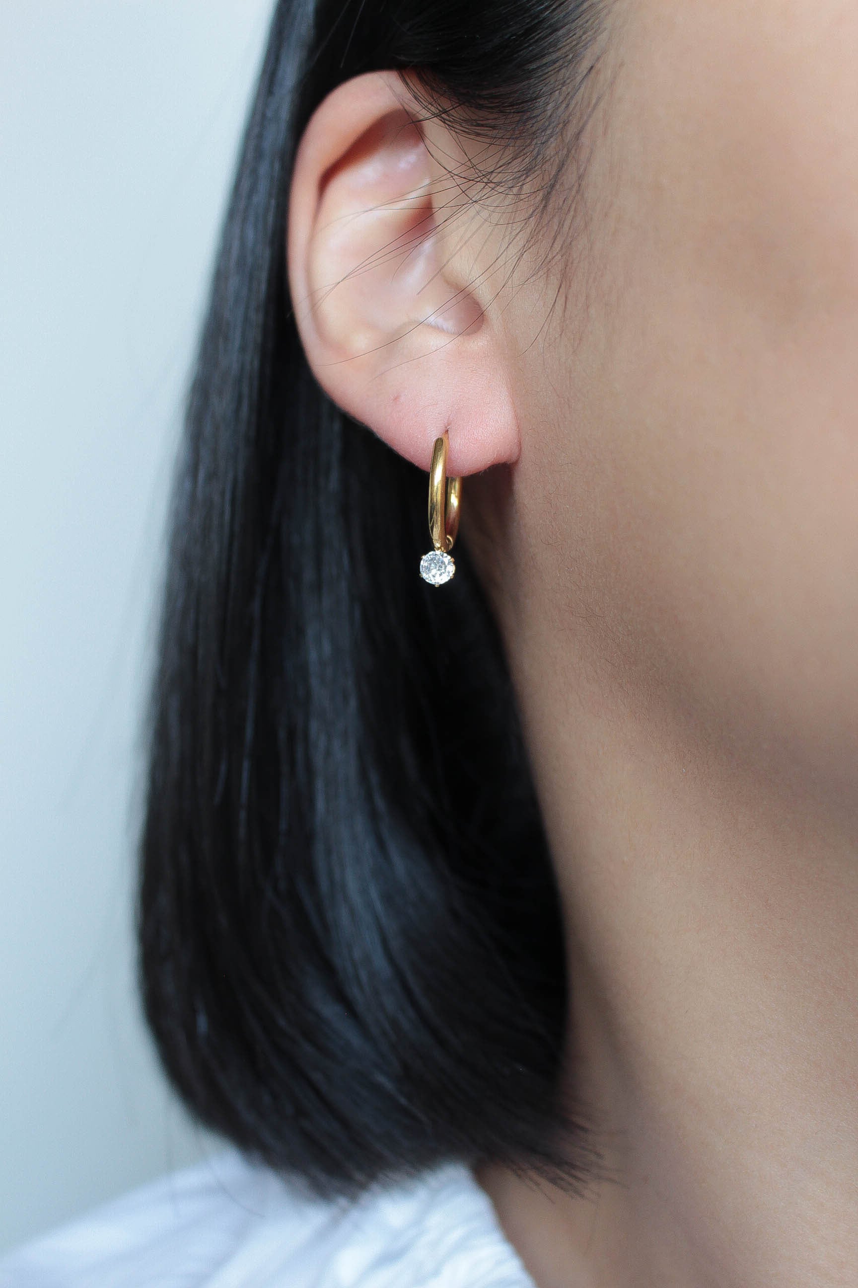 シンプルなフープピアスに、ジルコニアがついた上品なピアス。小さなジルコニアがキラキラと輝き、可愛らしい印象に。デイリーにご着用いただけます。