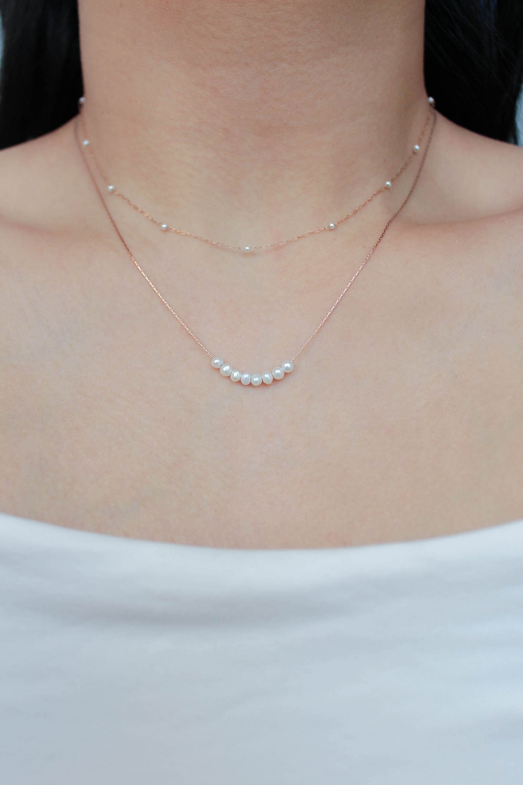 0.6mmの極細ネックレスに小粒の淡水パールをセットしたネックレス。