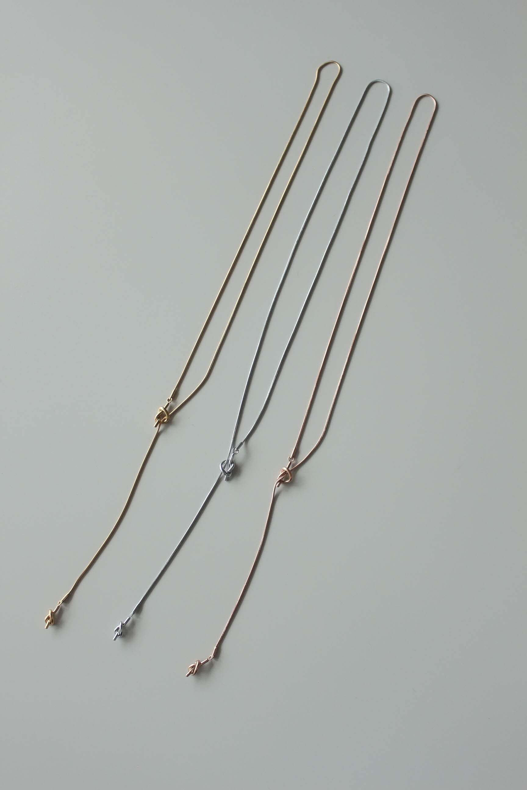 ロングタイプのボータイネックレス。前に持ってきても、後ろに垂らす形でも着用ができるお洒落ネックレスです。さりげない結び目デザインがより一層お洒落に。