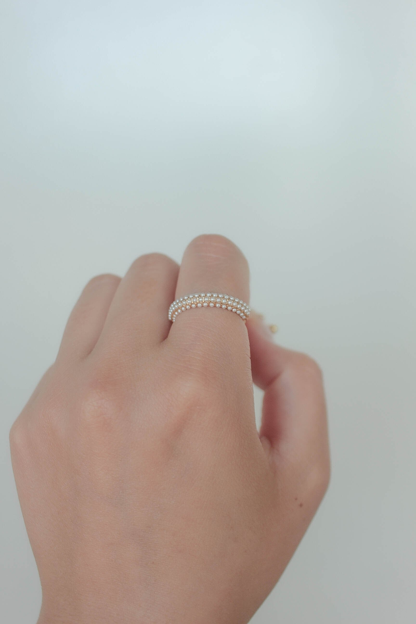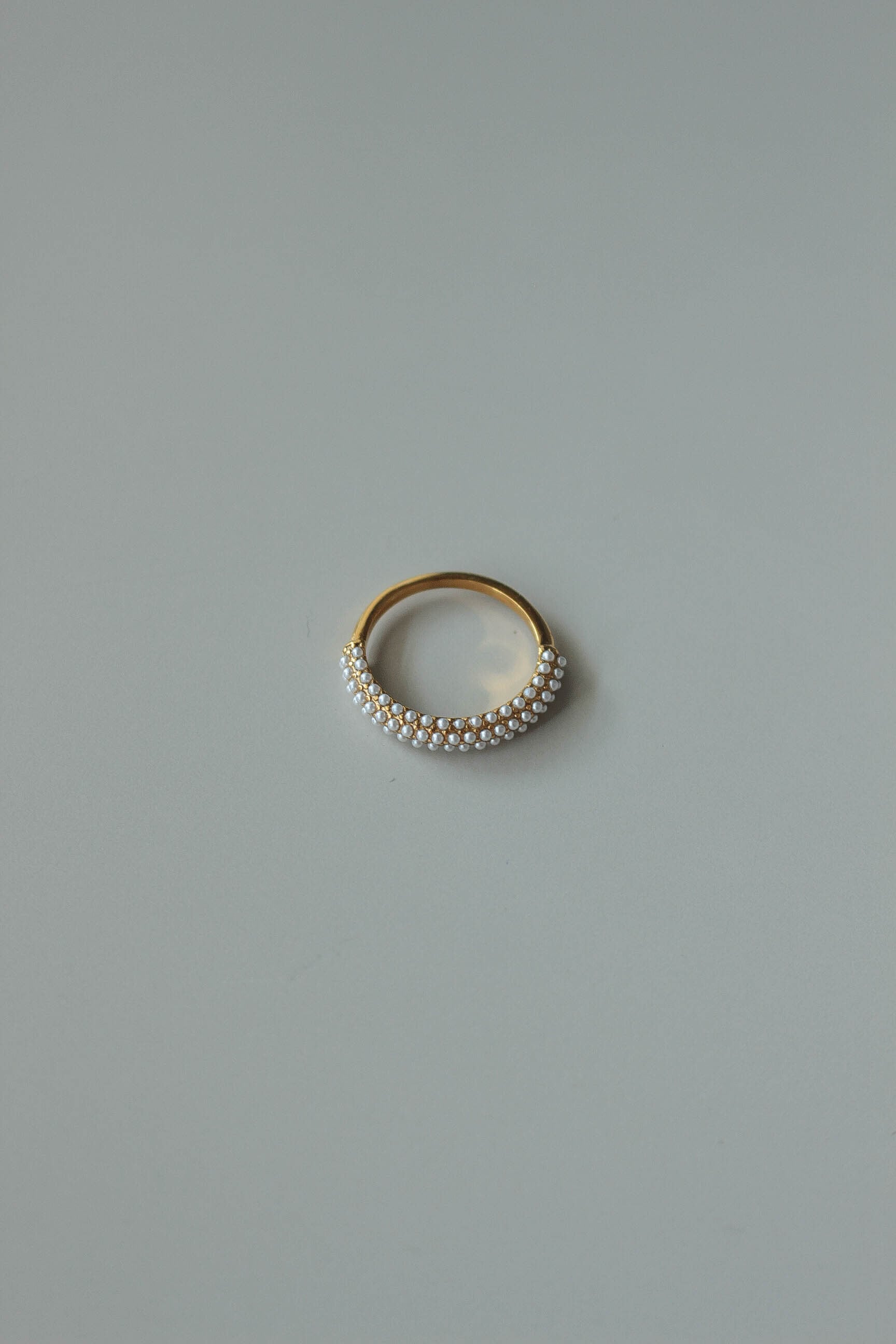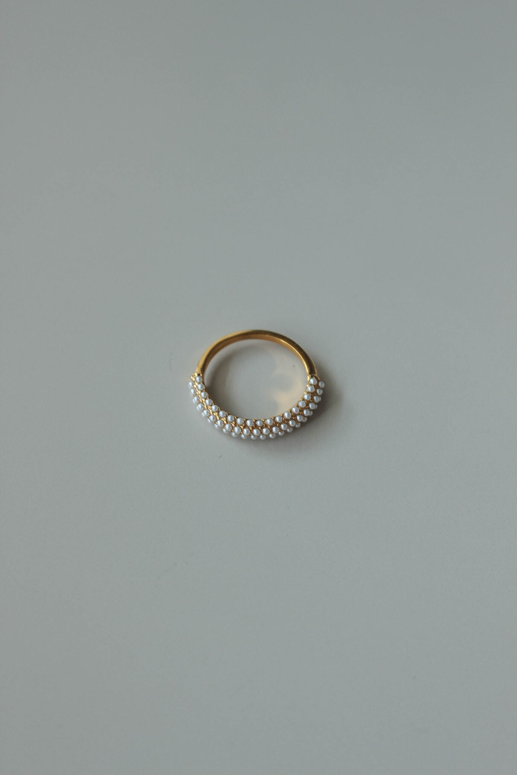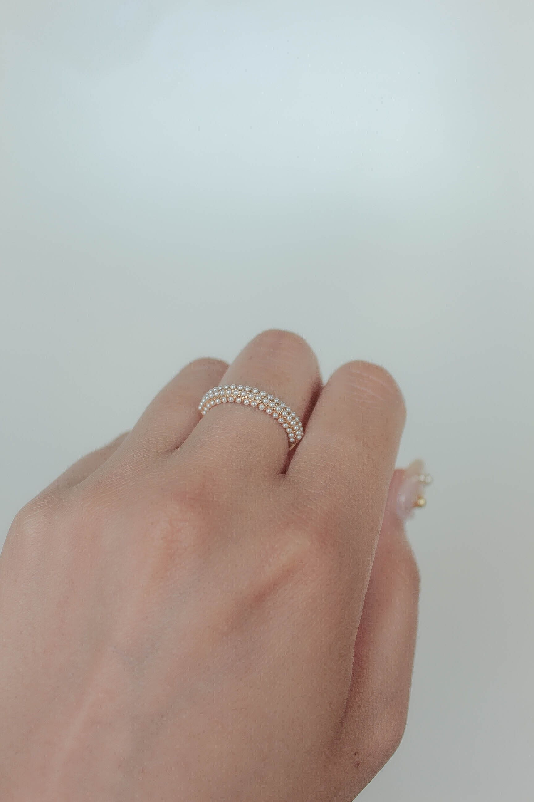 ふっくらデザインしたリングの先端に満遍なくパールを施した気品のあるリング。
