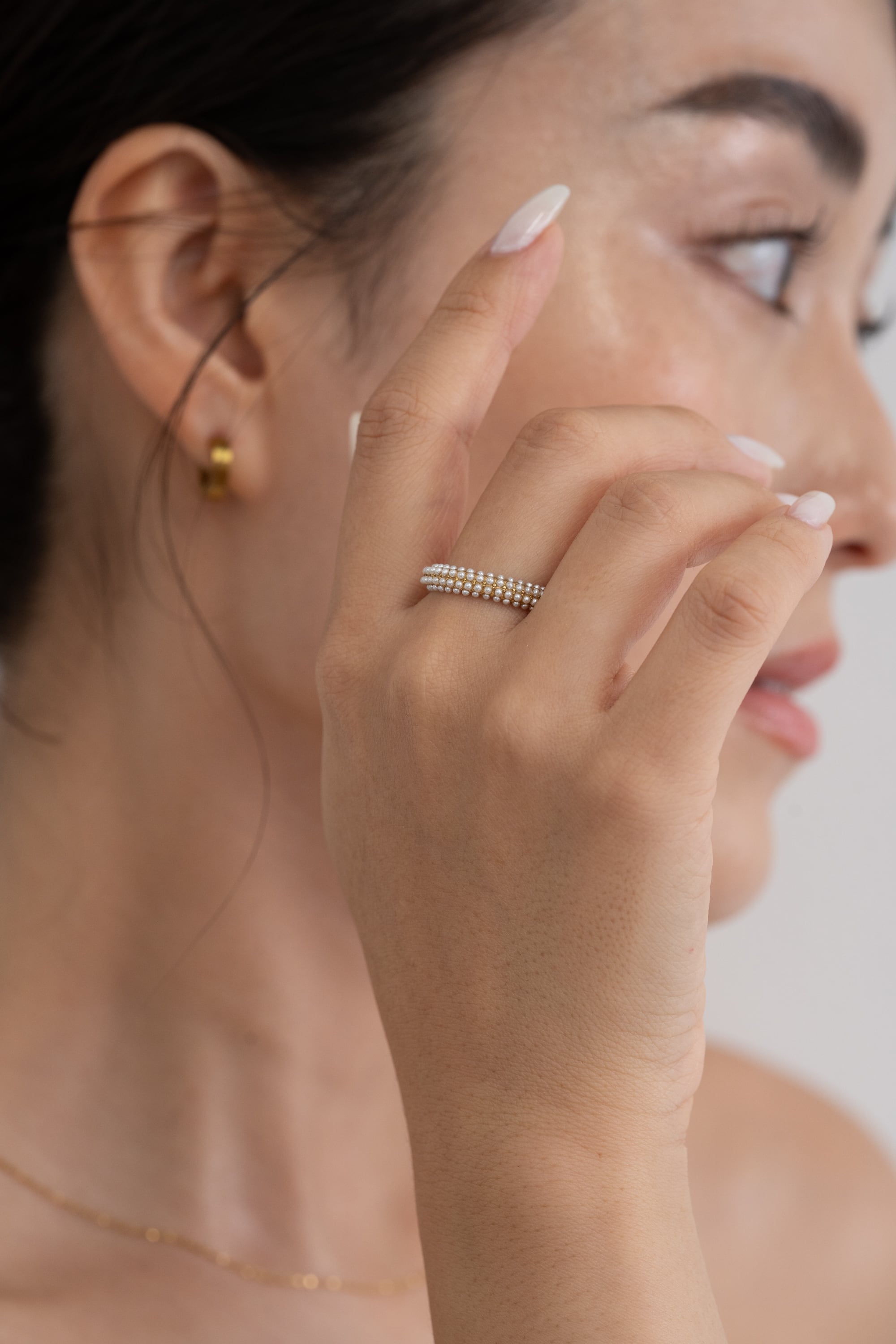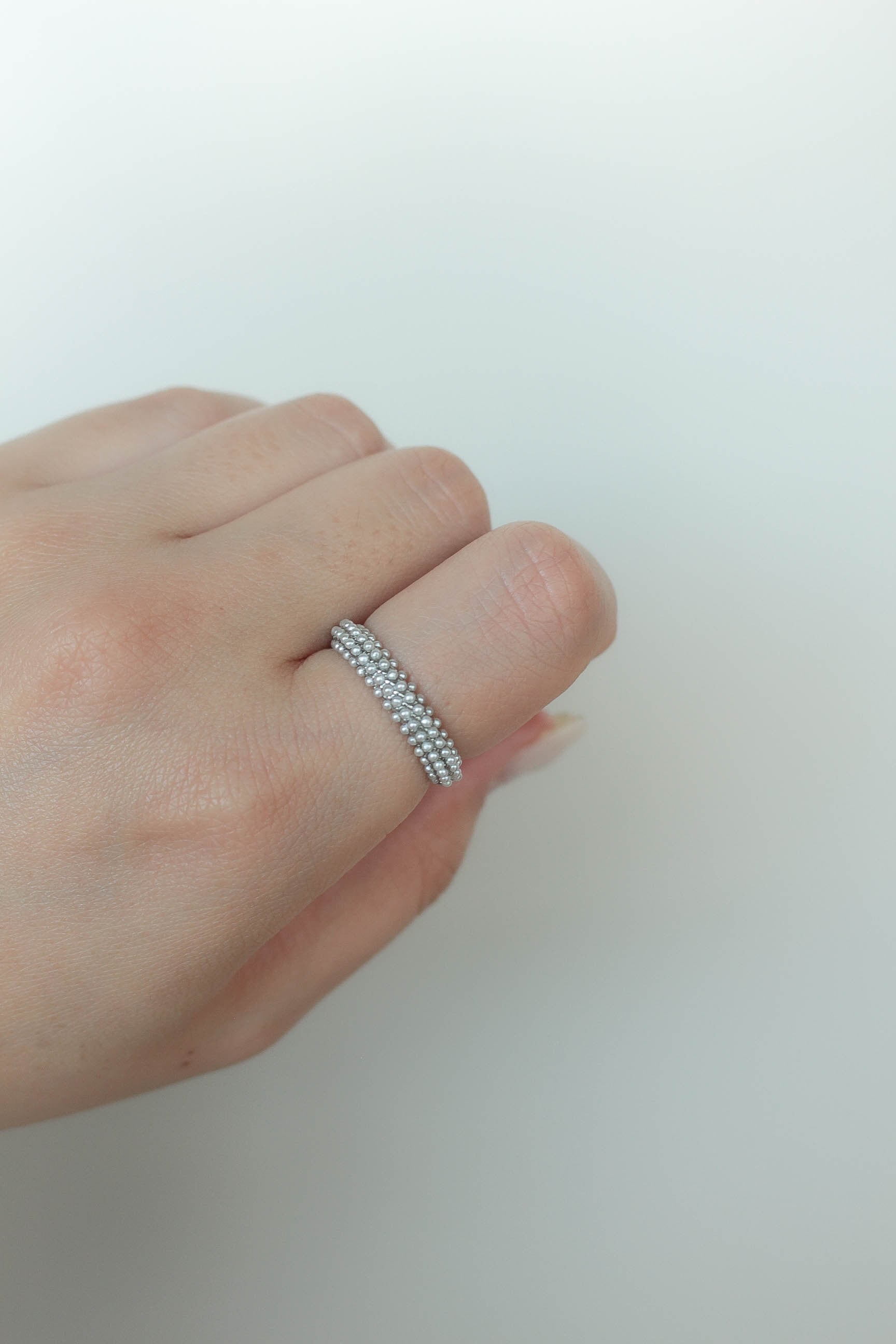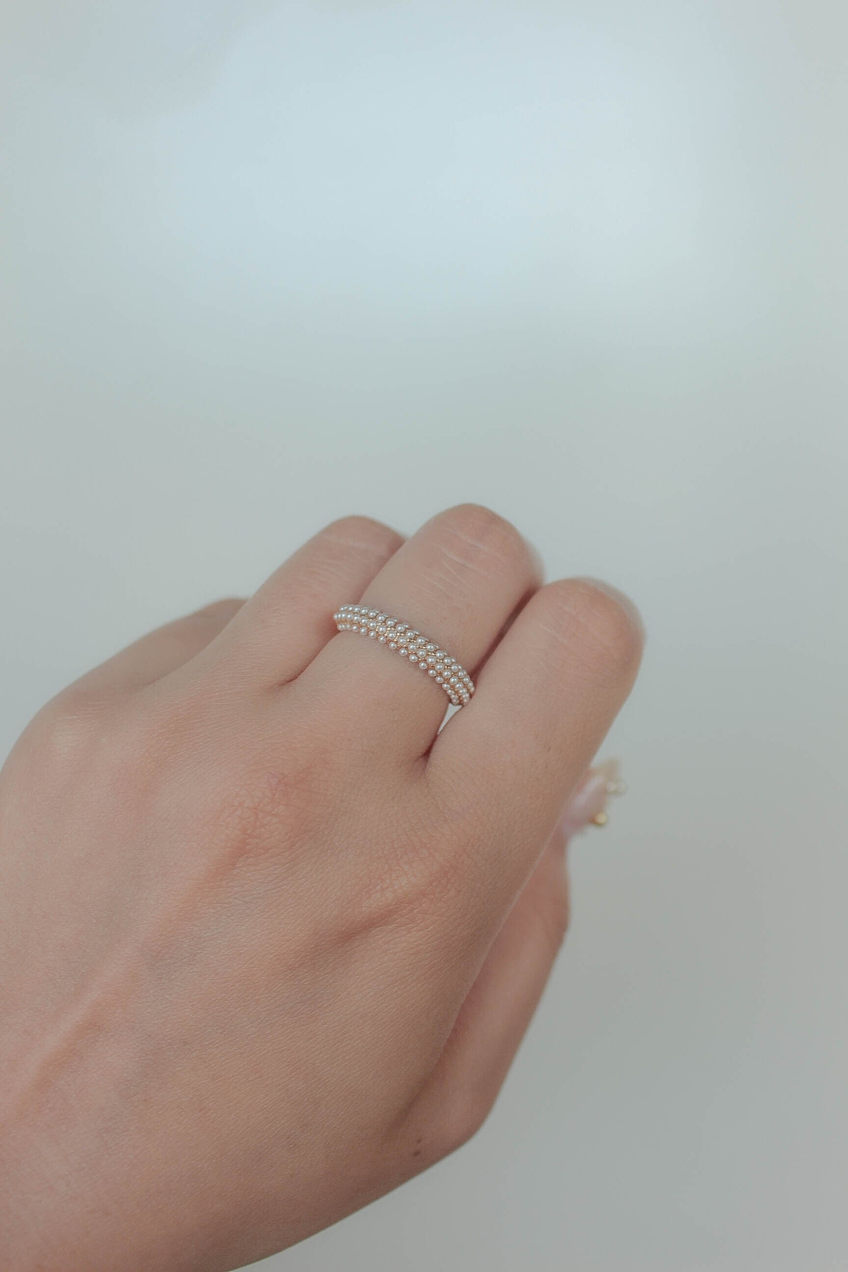 ふっくらデザインしたリングの先端に満遍なくパールを施した気品のあるリング。