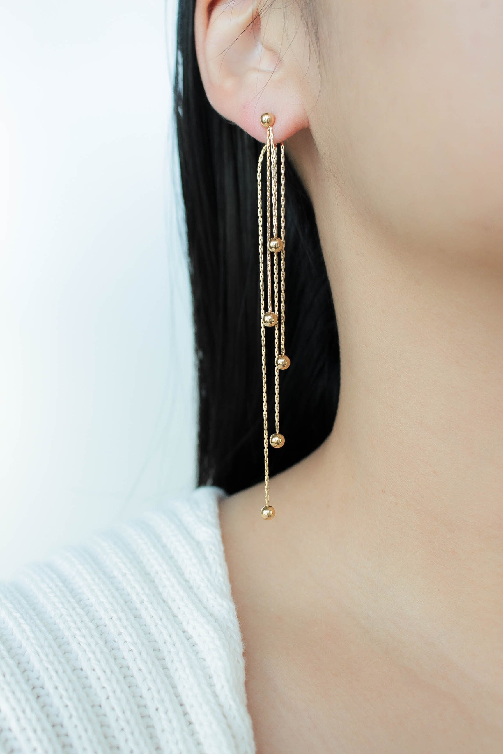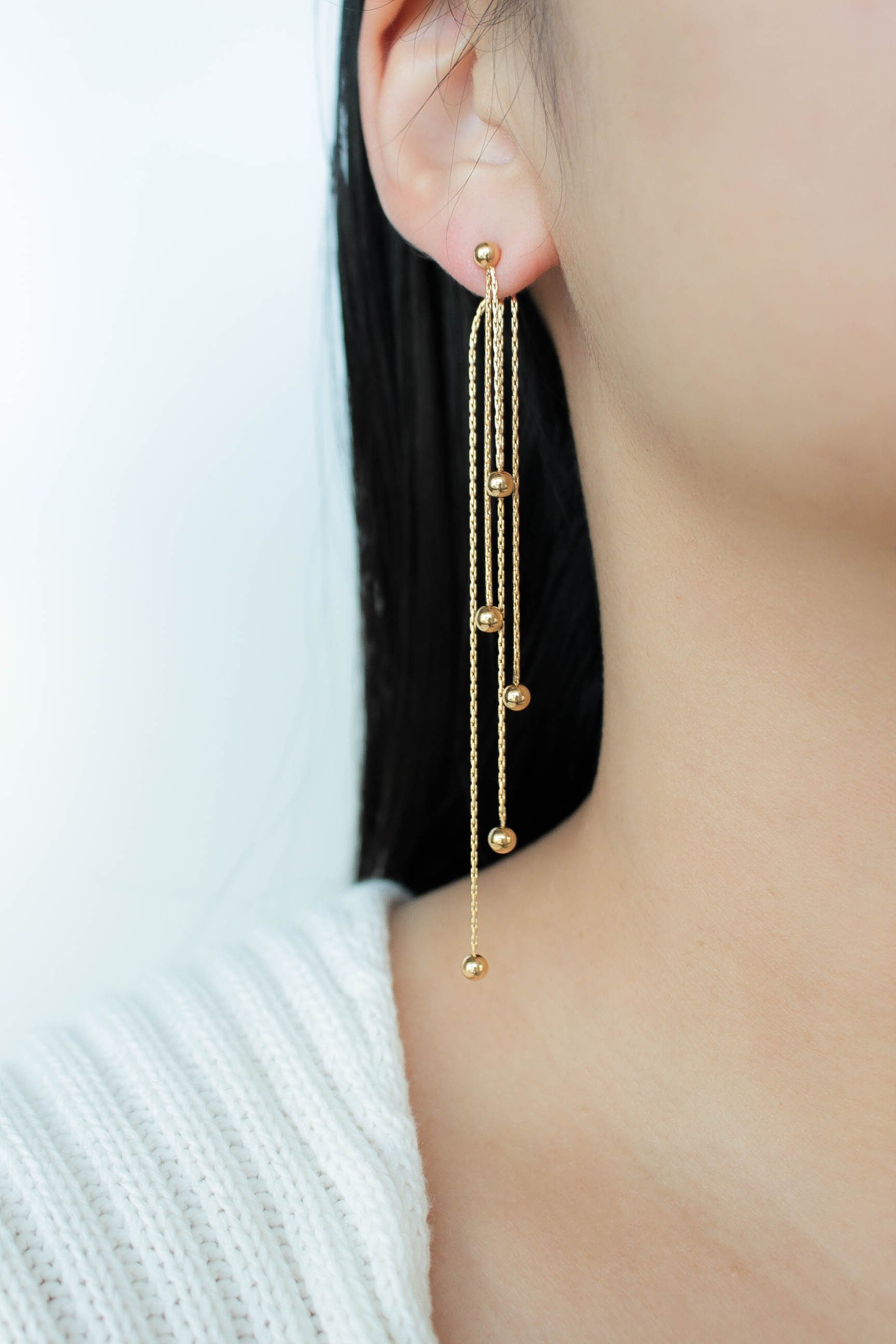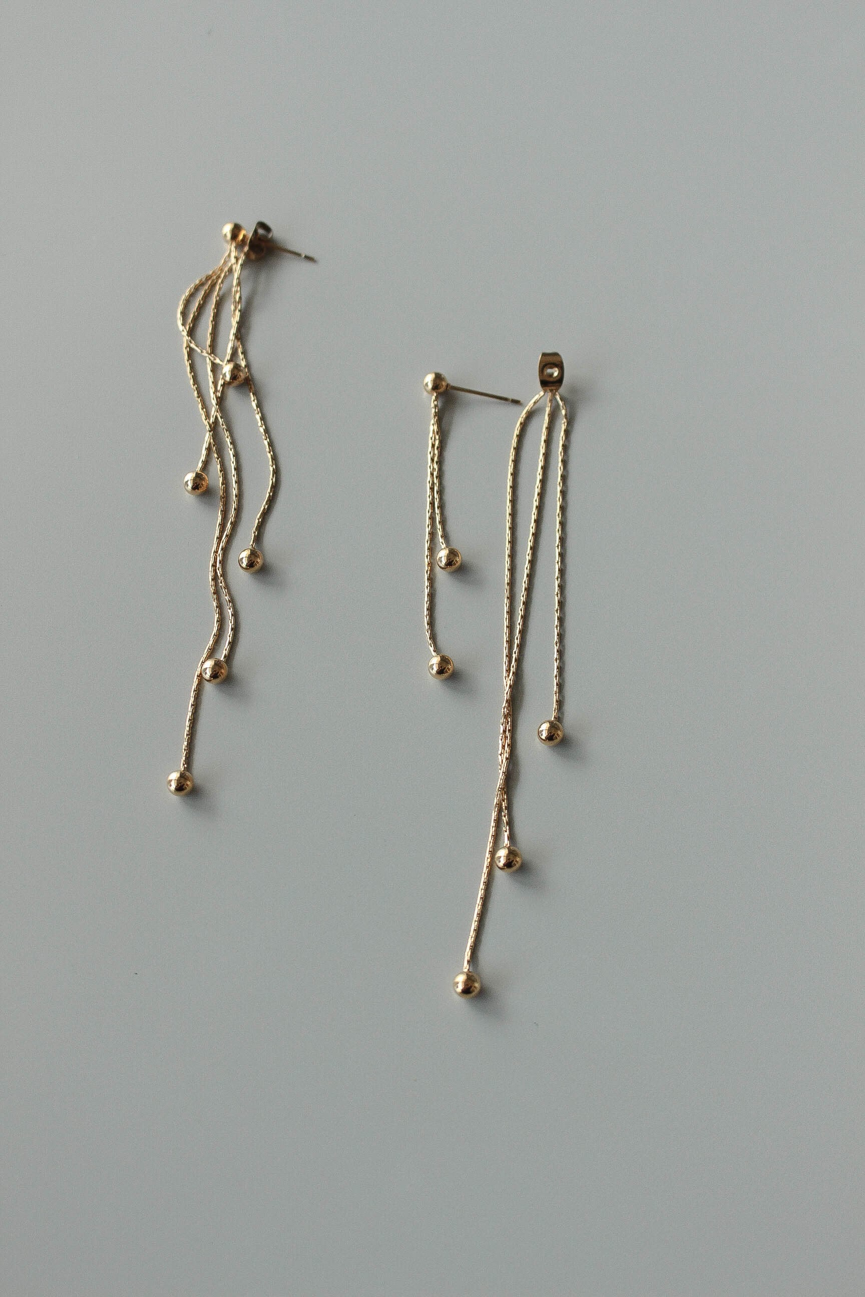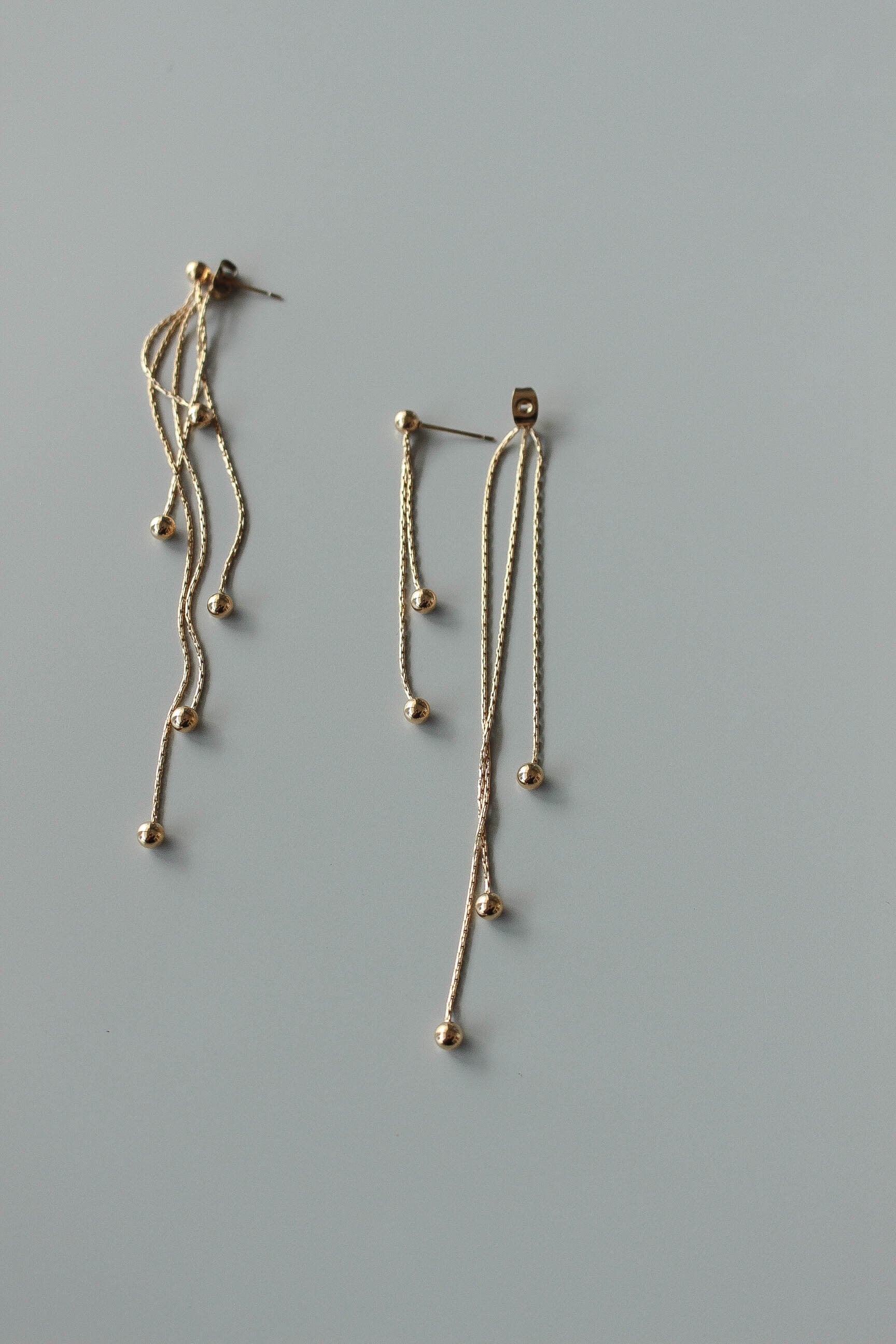 耳元で揺れ動くチェーンピアス。球状のデザイン枝垂れるように設置したドレッシーなピアス。綺麗めコーデやオケージョンにも最適なピアスです。