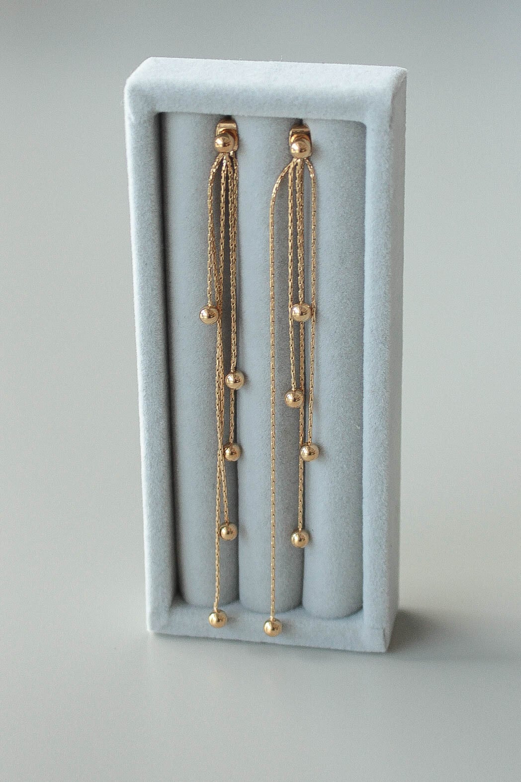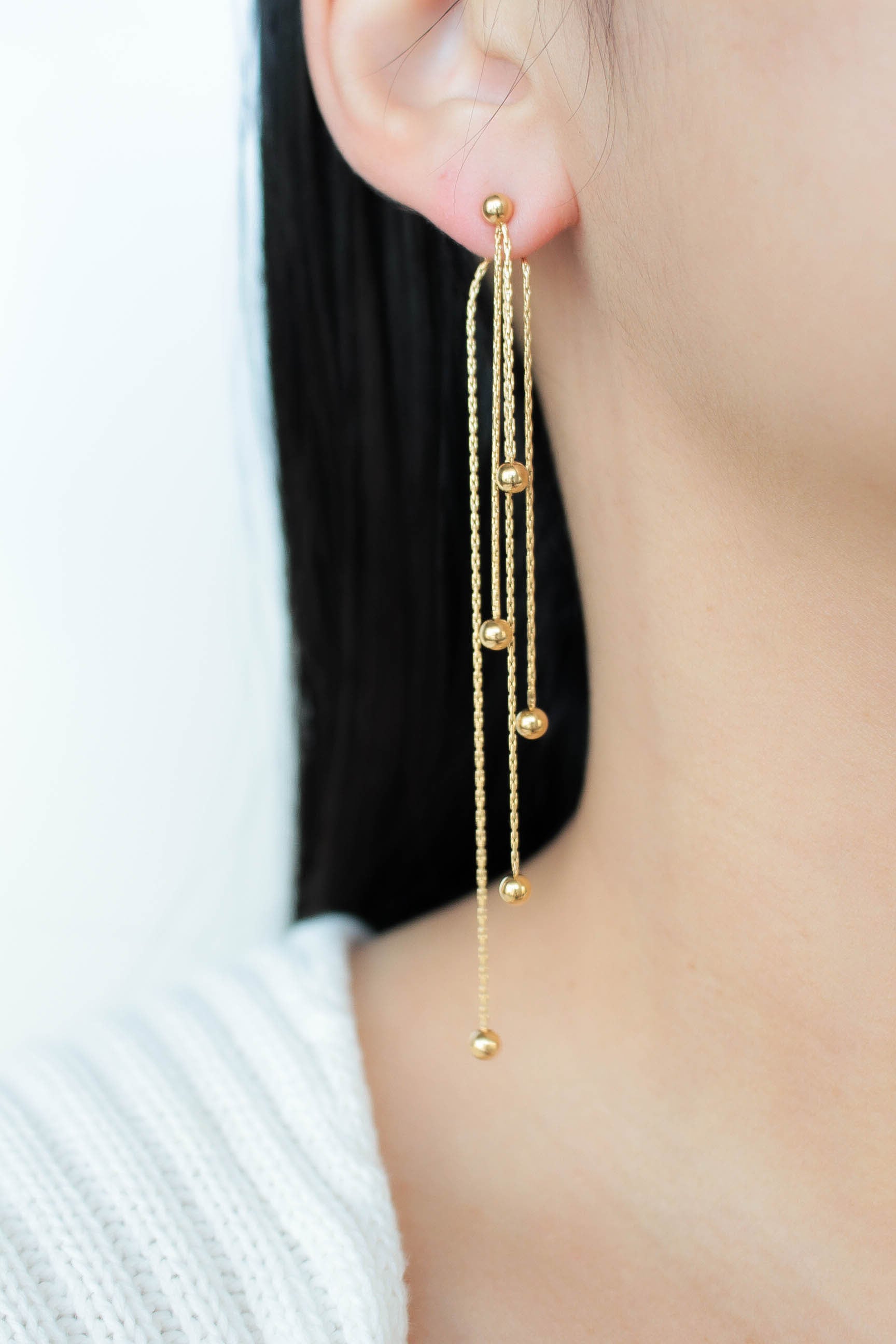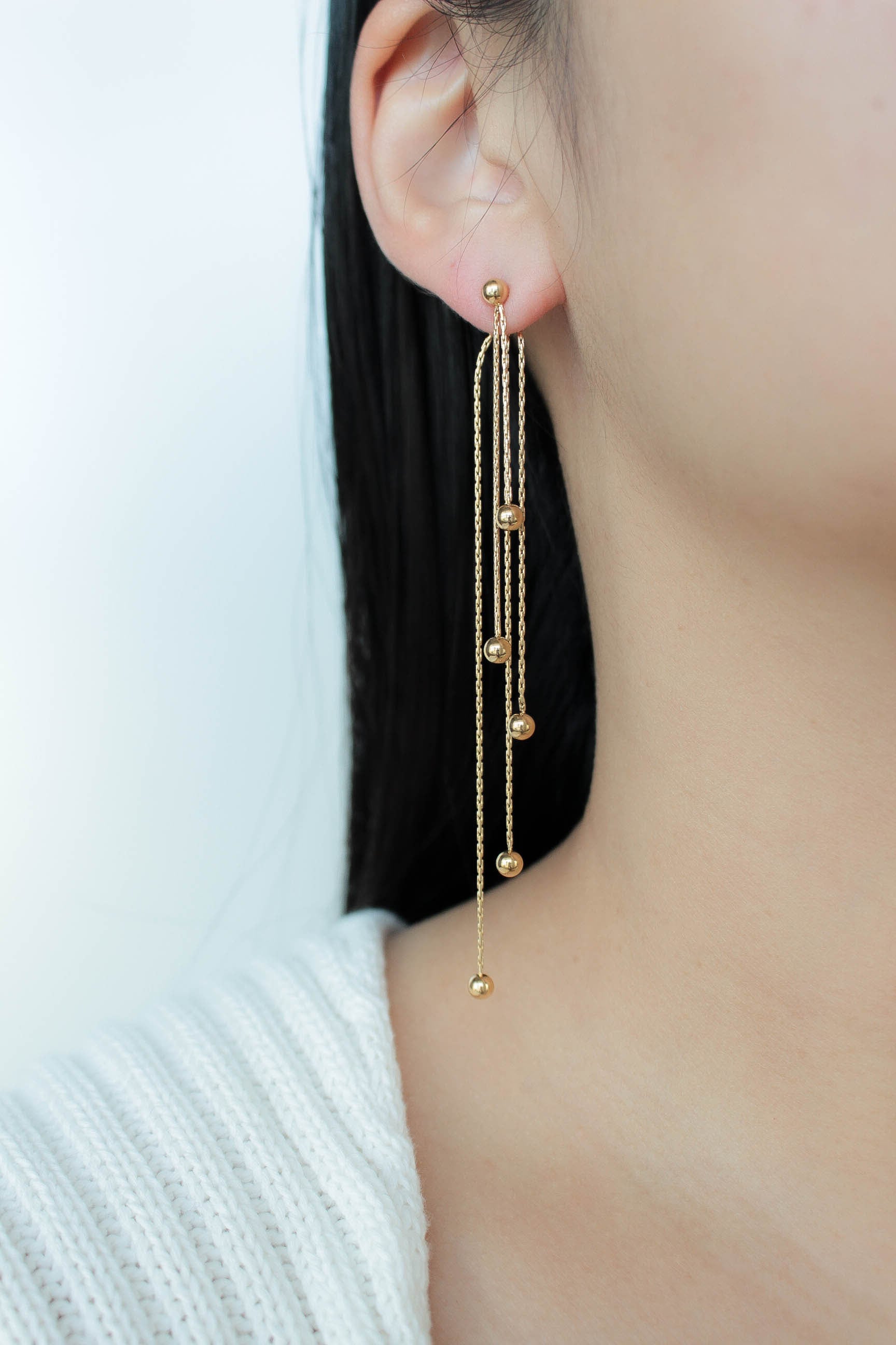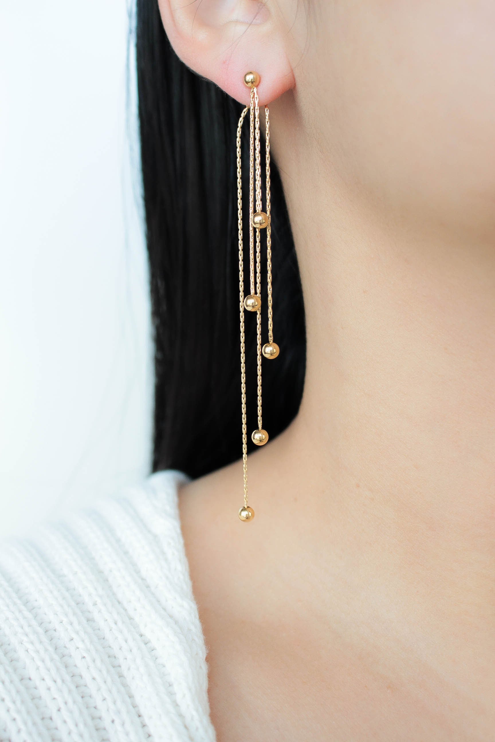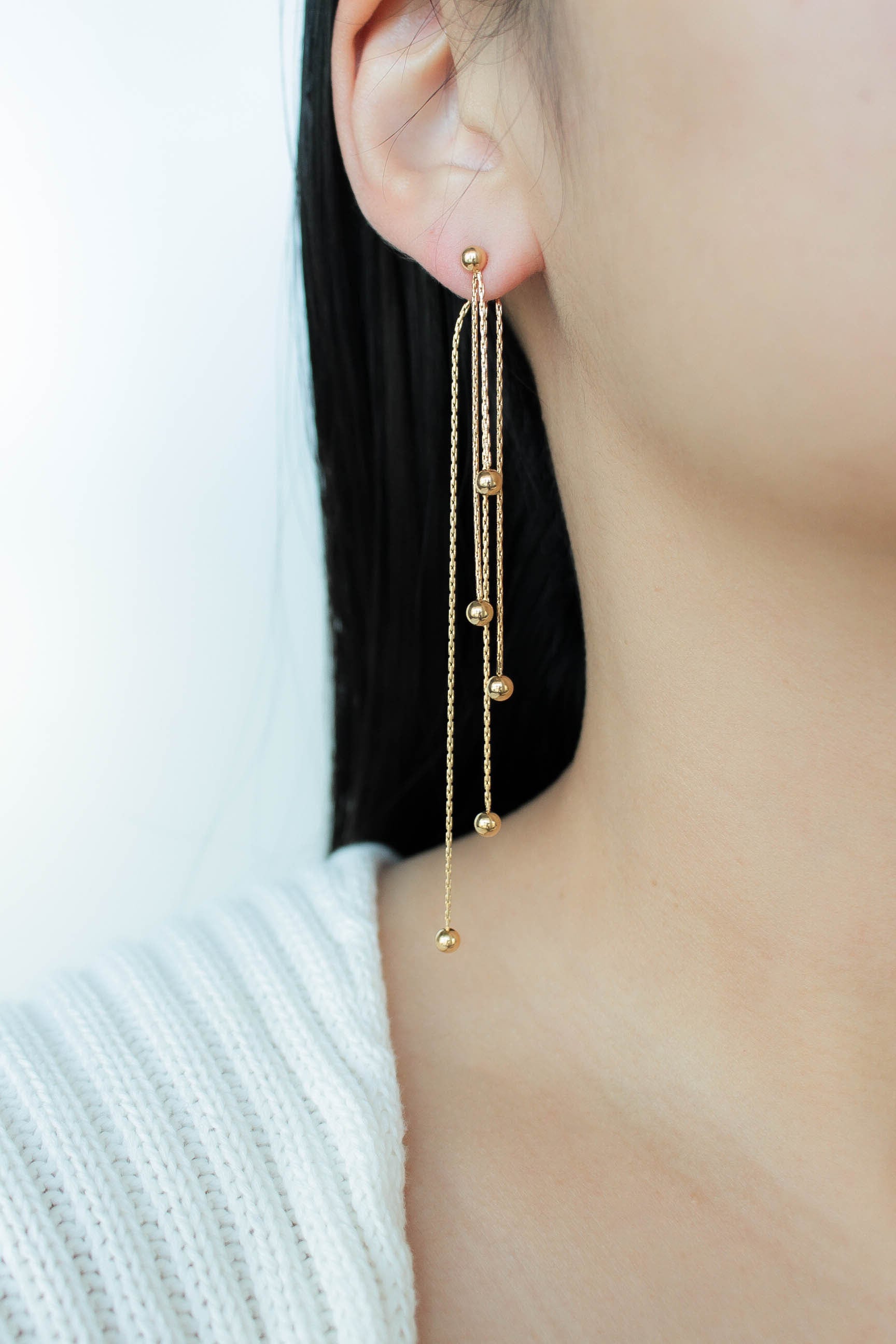 耳元で揺れ動くチェーンピアス。球状のデザイン枝垂れるように設置したドレッシーなピアス。綺麗めコーデやオケージョンにも最適なピアスです。
