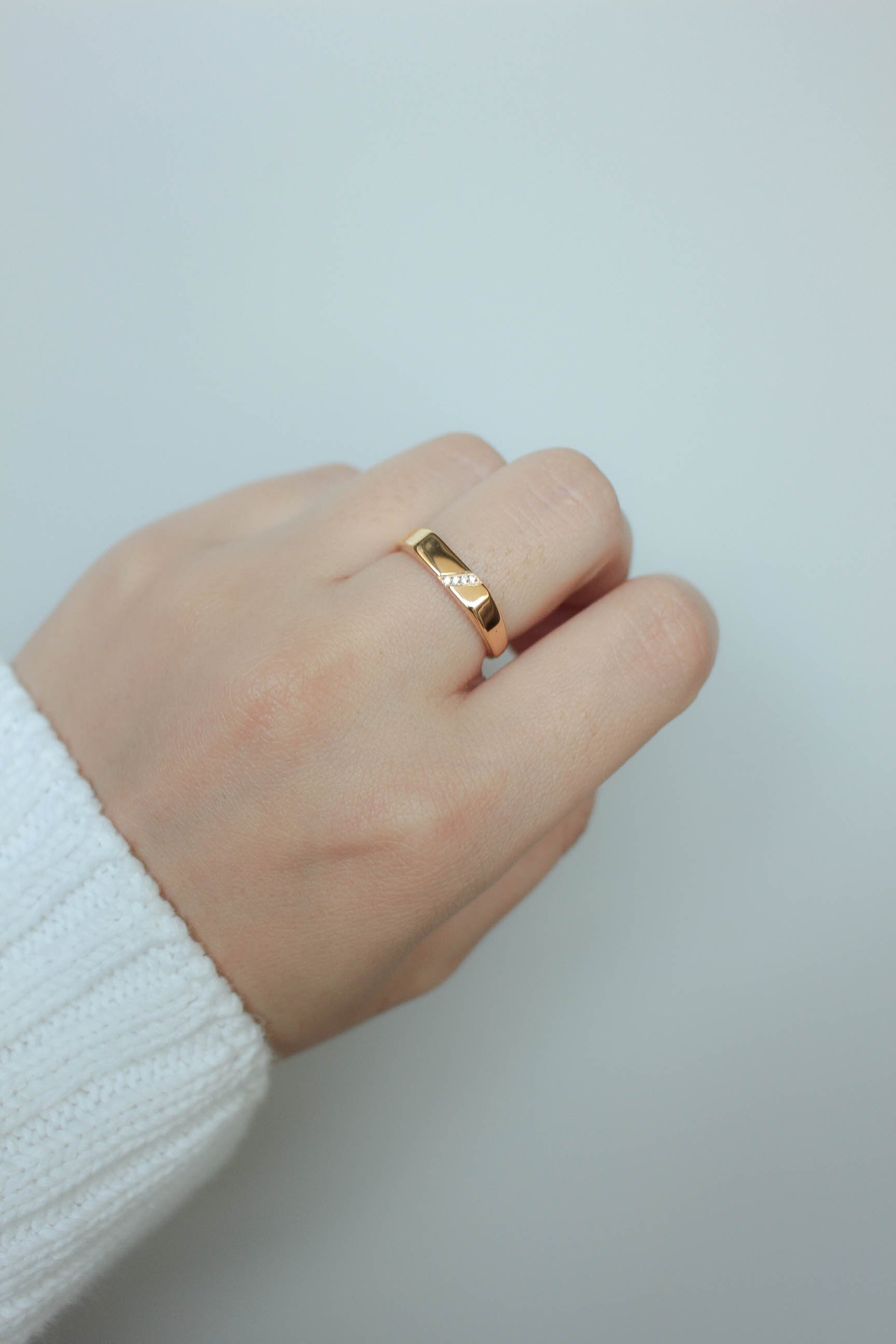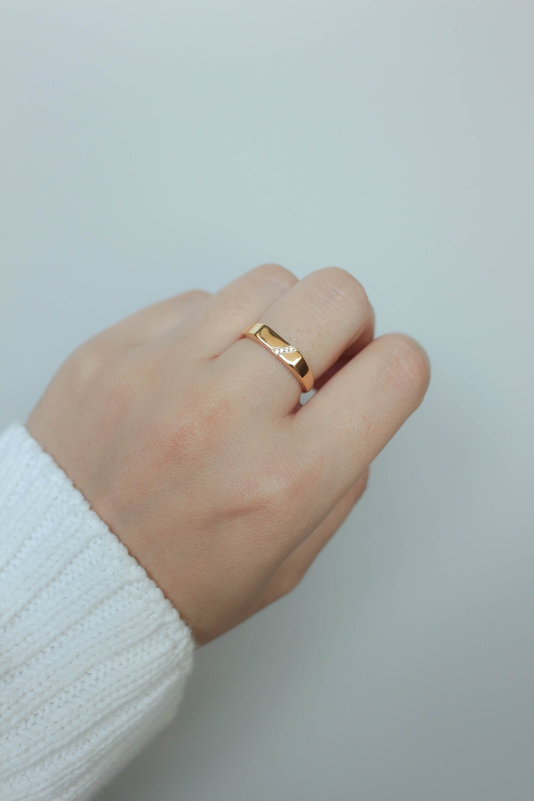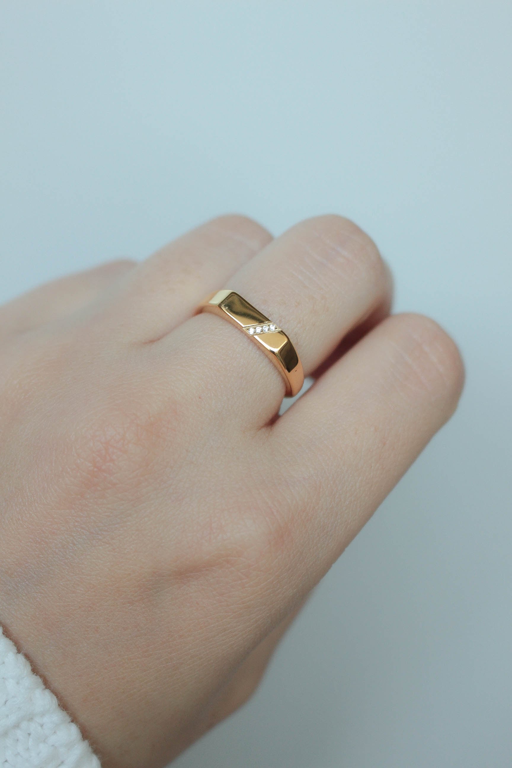 長方形のシグネットリングに斜めにカットを入れ細やかなジルコニアダイヤをセットしたアイテム。