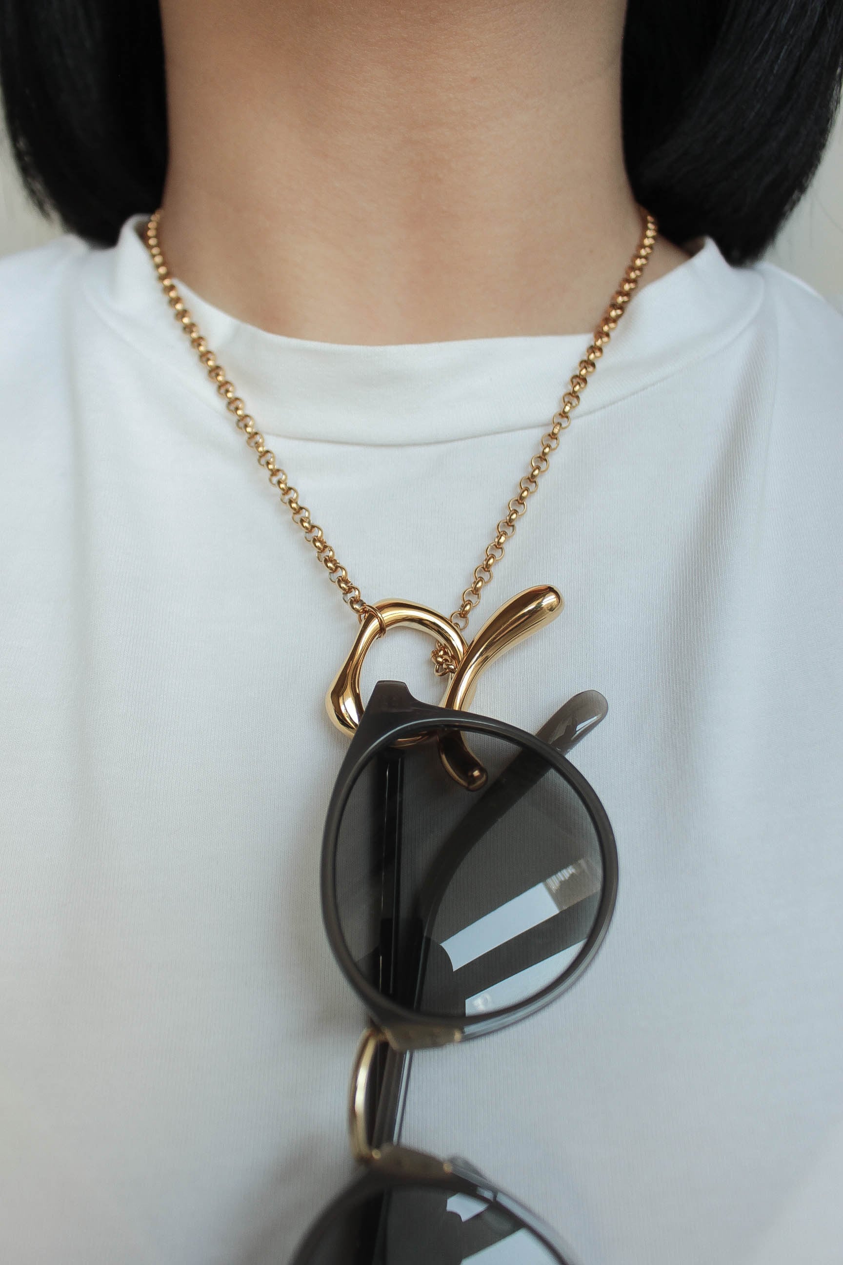 留め具にシンプルながらデザイン性を取り入れた存在感のあるラリエットネックレス。